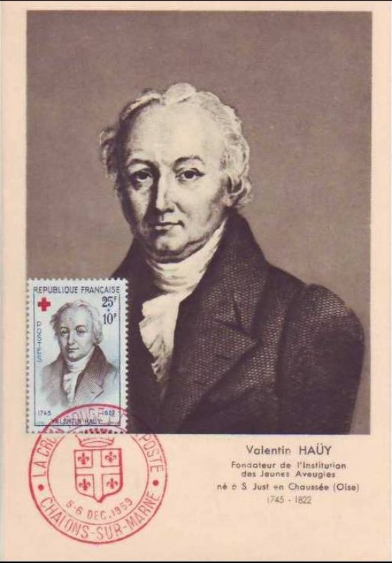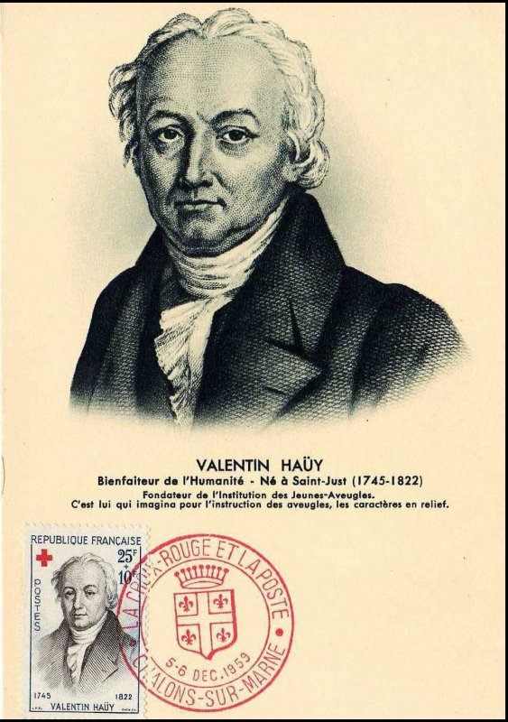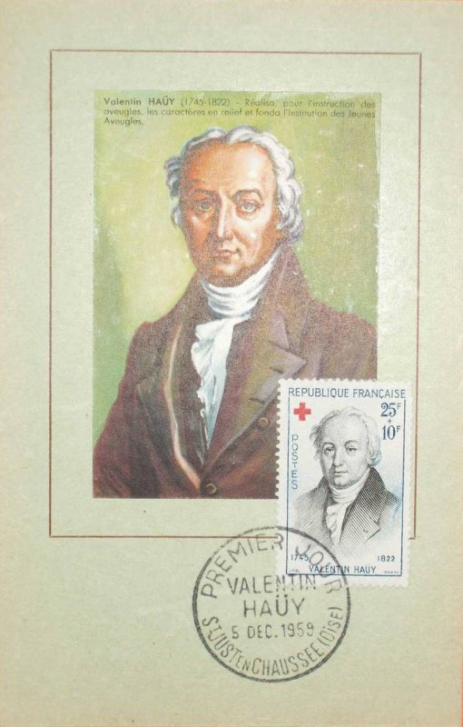 | Description | Au profit de la Croix-Rouge française. Valentin Haüy (1745-1822), pionnier de la lecture pour les aveugles, né à Saint-Just-en-Chaussée (provenant d'une feuille de 50 TP) |