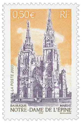 | Commentaire | Description synthétique du visuel du timbre : La basilique Notre-Dame de l’Épine est une des plus importantes églises de pèlerinage de France. Sa construction débuta au début du XVe siècle pour s’achever en 1527. Inscrite sur la liste du patrimoine mondial par l’Unesco, elle est un des jalons sur les chemins de Saint-Jacques de Compostelle et s’élève au milieu des plaines près de Chalons. La basilique est conçue comme une petite cathédrale, avec notamment à l’intérieur une élévation copiée sur celle de Reims. Sa façade, qui illustre le timbre, fut achevée en 1439. Avec ses flèches de pierre ajourée et son gable central elle est un des plus remarquables exemples d’architecture gothique flamboyant. |