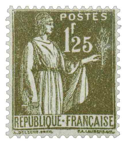| Commentaire | Émis en octobre 1932, le 1 f 25 olive appartient aux valeurs élevées de la série Paix. Il fut principalement utilisé pour les affranchissements recommandés, colis postaux légers et correspondances internationales. Sa période de vente, très courte — un peu plus d’un an, jusqu’en décembre 1933 — explique sa cote nettement supérieure aux autres valeurs de la série. Particularités philatéliquesLe tirage restreint et la courte durée de commercialisation font du 1 f 25 l’une des valeurs les plus recherchées de la série Paix. On observe plusieurs nuances d’olive, allant d’un olive brun soutenu à un olive plus froid, souvent liées aux variations d’encrage lors des premiers tirages typographiques. Sur documents, il devient particulièrement intéressant lorsqu’il apparaît en affranchissement isolé vers l’étranger (tarif 1re zone + surtaxes) ou en combinaison avec les 30 c, 40 c ou 1 f pour les recommandés. Les oblitérations nettes de 1932–1933 sont remarquées, car elles permettent d’authentifier les premiers tirages. |