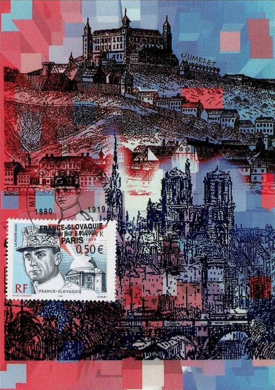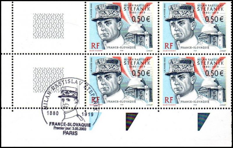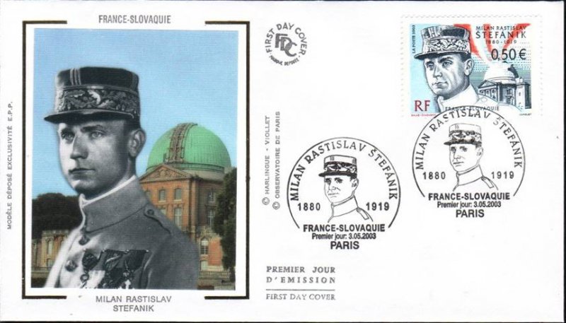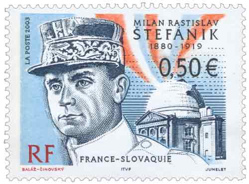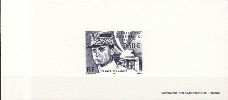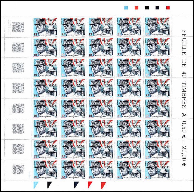 | Commentaire | Existe surchargé d'une seule bande phosphorescente à droite, existe également surchargé de deux bandes phosphorescentes à droite. Description synthétique du visuel du timbre : Milan Rastislav Štefánik est l’un des personnages les plus importants de l’histoire slovaque. Il œuvra pour soustraire les peuples tchèque et slovaque de la domination austro-hongroise et fut leur des principaux fondateurs de l’État tchécoslovaque. La France fut sa deuxième patrie. Il y vécut d’abord ses « années stellaires » durant lesquelles il travailla à l’observatoire de Meudon, prononça des traités scientifiques à l’Académie Française et organisa des expéditions d’observations astronomiques sur le Mont-Blanc. Il se consacra ensuite à une activité politique et militaire. Porté volontaire dans l’aviation française, il passa rapidement au grade de général d’aviation. Son avion s’écrasa près de Bratislava en 1919.Émission commune avec la Slovaquie. |