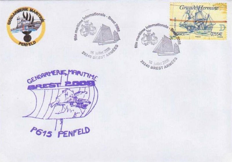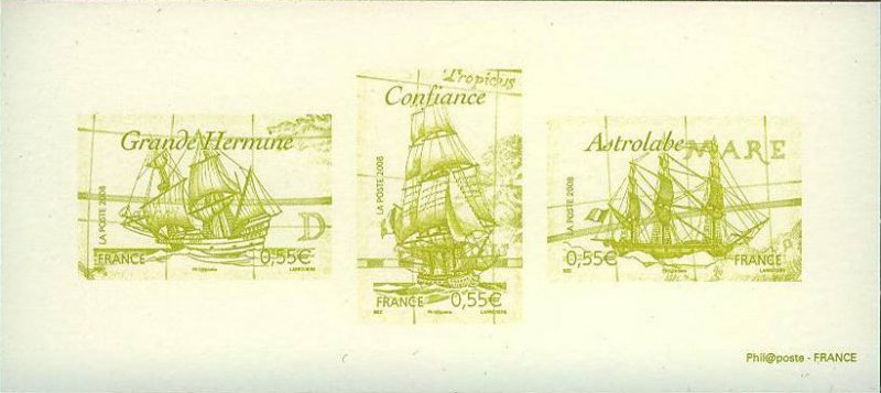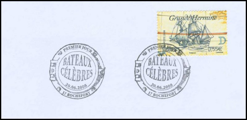 | Commentaire | Avec un cachet premier jour en forme de hublot, la mise en vente anticipée a lieu du 20 au 22 juin au Salon du timbre, à Paris. Le week-end du 20 au 22 juin, des manifestations ont également lieu avec un cachet portant la mention « premier jour » à bord du chasseur de mines Cassiopée à Brest, au chantier de l'Hermione à Rochefort et à Rouen. Avec un cachet sans mention « premier jour », une mise en vente anticipée du bloc a lieu le 20 juin au musée La Pérouse d'Albi. En 2009, le bloc est élu « plus beau timbre de l'année » dans la catégorie « bloc de timbres thématiques » suite à un vote des internautes, organisé par Phil@poste. |