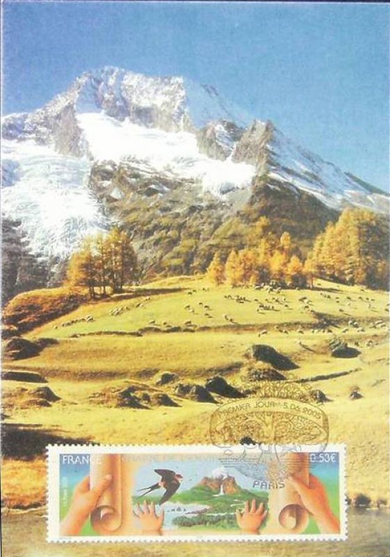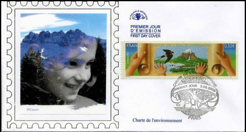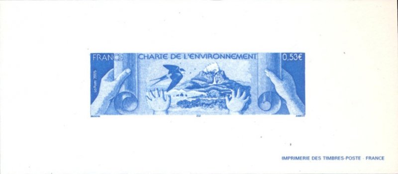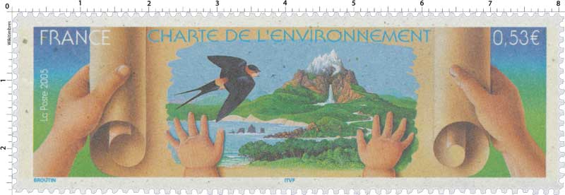 | Commentaire | Visuel : TP imprimé sur un papier recyclé, pour illustrer les valeurs portées par cette nouvelle charte d'une écologie humaniste, d'une nouvelle relation entre l’homme et la nature. Un parchemin que les mains d’un adulte déroulent et que celles d’un très jeune enfant maintiennent, symbolisant l’héritage que nous voulons transmettre aux générations futures. La scène évoque la nature, sous la forme d’un jardin d’Éden et met l’accent sur sa fragilité : c’est ainsi qu'une hirondelle Rousseline, espèce menacée, est représentée sur le visuel. Le projet de loi constitutionnel relatif à la Charte de l’environnement a été adopté par le Conseil des ministres en juin 2003 et sera débattu au Parlement fin 2003. Pour illustrer les valeurs portées par cette nouvelle charte (une écologie humaniste, une nouvelle relation entre l’homme et la nature), un timbre est émis par La Poste, qui a choisi de l’imprimer sur papier recyclé. La charte est représentée par un parchemin que les mains d’un adulte déroulent et que celles d’un très jeune enfant maintiennent, symbolisant l’héritage que nous voulons transmettre aux générations futures. Sur le parchemin, une scène évoque la nature, sous la forme d’un jardin d’Éden et met l’accent sur sa fragilité : c’est ainsi une hirondelle Rousseline, une espèce menacée, qui est représentée sur le visuel |