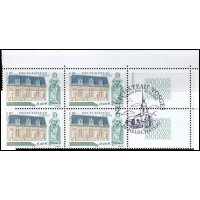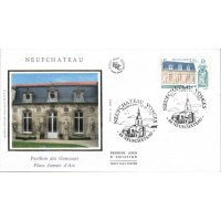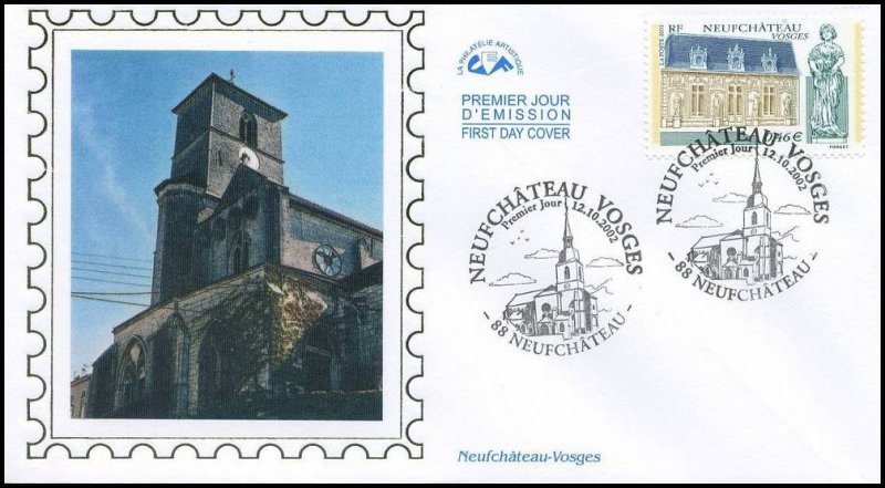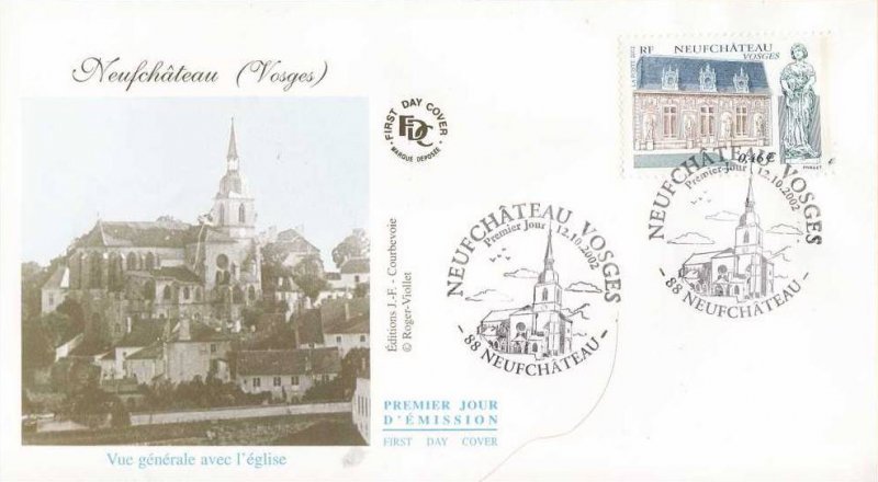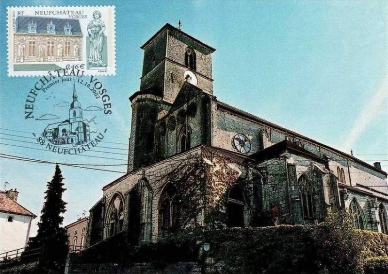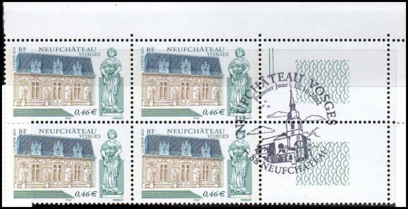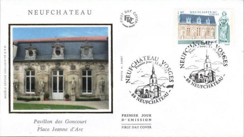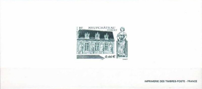 | Commentaire | Existe surchargé d'une bande phosphorescente à droite. Existe non surchargé accidentellement de bandes phosphorescentes. Description synthétique du visuel du timbre : Le duc de Lorraine Thierry II établit sous l’épiscopat de Pibon (après 1070), une nouvelle ville fortifiée sur le territoire de la paroisse Saint-Christophe, ville qualifiée de novum castrum qui conservera son nom durant tout le Moyen Age sous la forme de neuf chastel, d’où Neufchâteau. Outre les églises Saint-Christophe et Saint-Nicolas et l’Hôtel de Houdreville, la ville abrite également des hôtels particuliers. Au fond du jardin de l’un d’eux s’élève le pavillon des Goncourt qui illustre le visuel du timbre, agrémenté de l’agrandissement de l’une des sculptures qui en orne la façade. |