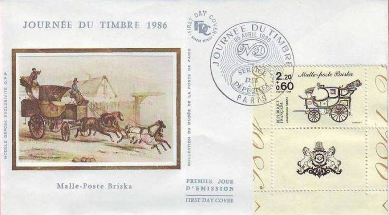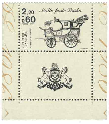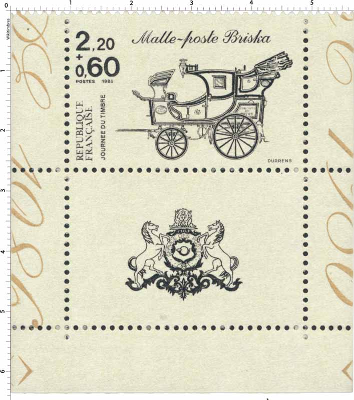| Description | Journée du timbre. Malle-poste Briska, (du russe britschka, c'est une calèche légère, d'origine autrichienne, à la caisse en osier). Timbre provenant de carnet (voir N°2410) |