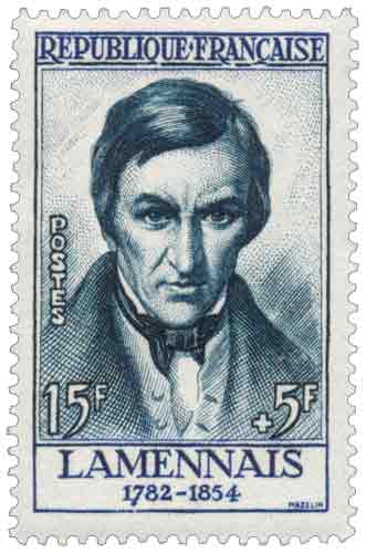 | Commentaire | Timbre grevé d'une surtaxe au profit de la Croix-Rouge française Émis en 1957 par la France dans une série de six timbres-poste consacrée à des personnages français célèbres et grevée d’une surtaxe au profit de la Croix-Rouge française, le timbre commémoratif dédié à Félicité Robert de Lamennais est mis en vente à partir du 17 juin après une émission anticipée à Saint-Malo, et s’inscrit dans les émissions caritatives de l’après-guerre associant usage postal courant et hommage intellectuel ; imprimé en taille-douce rotative au format vertical, il porte une valeur faciale de 15 francs assortie d’une surtaxe de 5 francs et répond aux besoins d’affranchissement de la lettre simple selon les tarifs de 1957, tout en prenant place dans une série homogène par son format, sa dentelure et sa technique d’impression ; le sujet évoque le parcours du prêtre, écrivain et penseur breton, figure majeure du catholicisme libéral du XIXᵉ siècle devenu partisan d’un humanisme social et mystique après la condamnation de ses thèses par la papauté, auteur notamment des Paroles d’un croyant et traducteur de L’Imitation de Jésus-Christ, dont l’influence intellectuelle et politique marqua durablement les débats religieux et sociaux de son temps en France. |