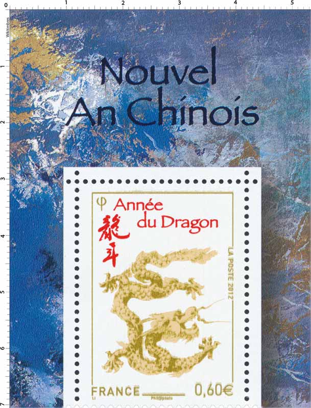 Timbre : Nouvel An chinois - Année du Dragon Mesures Format d'imp - Dents incluses - Forme vertical Phosphore 2 barres phosphorescentes Impression héliogravure Complément xxxxx Couleur quadrichromie Valeur 0,6 € Dentelure 13 x 13 1/4 Emis en bloc-feuillet de 5 TP Quantité 1 900 000 Auteurs Dessinateur Zhongyao Li Graveur xxxxx Mise en page Aurélie Baras Mentions création de Zhongyao Li Numéros & Dates N° Philatelix - N° Michel 5255 Date d'émission 09/01/2012 Date de retrait 25/01/2013 Classements Groupe Nouvel An chinois 2012 Catégorie Timbres poste Familles Nouvel An chinois fêtes festivités Usage Lettre 20 g France Régions - Départements - Description Nouvel An chinois - Année du Dragon Commentaire - Mes timbres & notes personnelles www.wikitimbres.fr