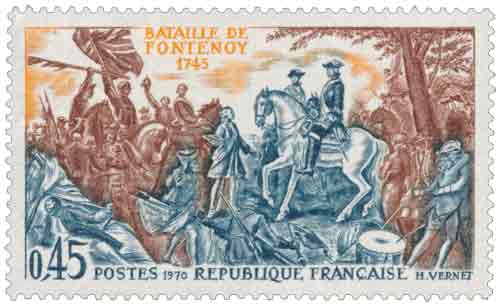 Ce timbre-poste français émis en 1970 s’inscrit dans la série commémorative « Histoire de France », destinée à rappeler de grands événements fondateurs à travers une iconographie immédiatement lisible, et évoque la bataille de Fontenoy du 11 mai 1745, victoire emblématique remportée par les armées françaises commandées par Maurice de Saxe dans le cadre de la guerre de Succession d’Autriche, conflit européen majeur opposant notamment la France et ses alliés aux puissances anglo-hollandaises et autrichiennes ; dessiné et gravé en taille-douce par Albert Decaris d’après une composition de Horace Vernet, ce timbre horizontal de 0,45 F est conçu pour l’affranchissement du courrier intérieur non urgent et s’intègre dans une politique postale de la fin des années 1960 visant à diffuser une lecture pédagogique et synthétique de l’histoire nationale par l’image, en associant le portrait des grands acteurs et la représentation des faits d’armes marquants. La scène choisie met en avant la reddition des troupes anglaises, épisode devenu symbolique de la bataille et largement popularisé par la peinture du XIXᵉ siècle, traduisant une vision héroïsée et ordonnée du combat caractéristique de la tradition dite de la « guerre en dentelles », perception qui s’est imposée durablement dans la mémoire collective malgré la complexité stratégique du conflit et l’issue diplomatique défavorable à la France lors du traité d’Aix-la-Chapelle en 1748. Le choix de Fontenoy dans cette série souligne ainsi moins les conséquences politiques immédiates que la valeur symbolique de la victoire et la figure du commandement militaire français au XVIIIᵉ siècle, offrant au timbre un rôle de médiateur entre récit historique, iconographie académique et usage postal quotidien. |