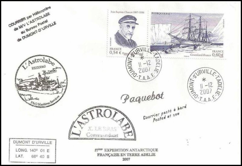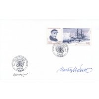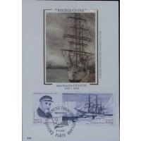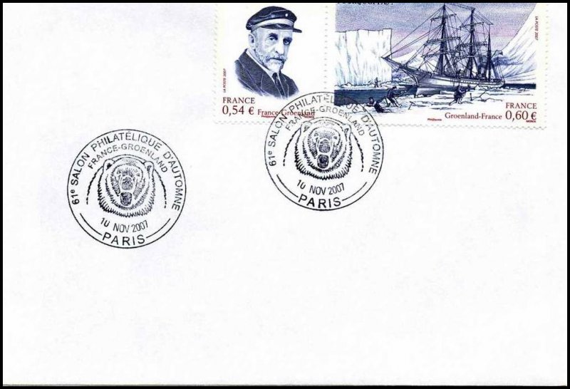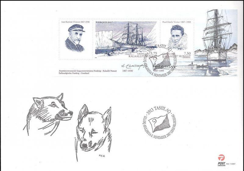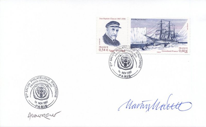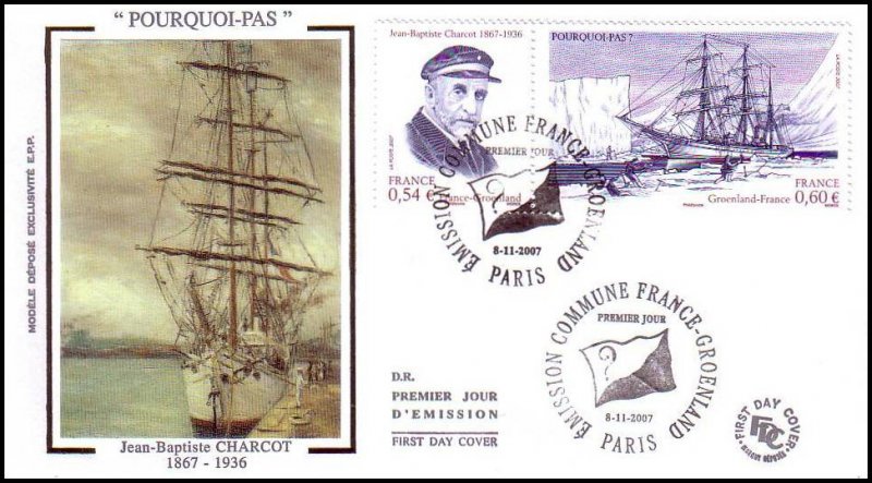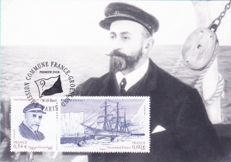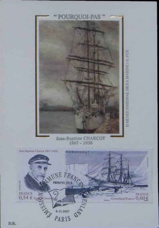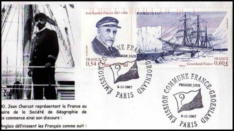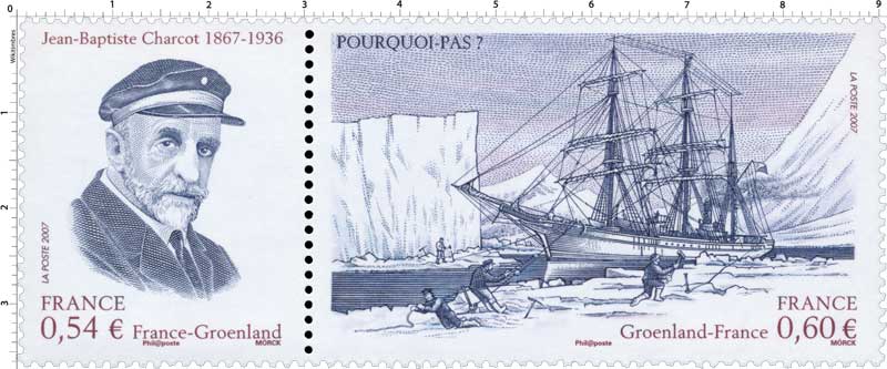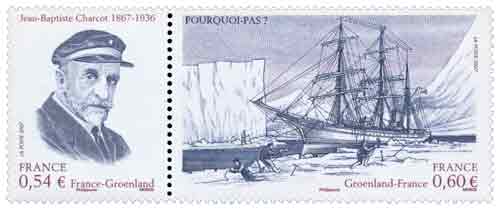 | Commentaire | Jean-Baptiste Charcot 1867 – 1936 POURQUOI-PAS ? Les timbres de l’émission commune avec le Groenland illustrent le thème des expéditions internationales parties du Groenland. Deux timbres en diptyque sont émis par la France, un portrait de Jean-Baptiste Charcot sur celui de gauche, son bateau le Pourquoi-Pas ? à droite. Médecin, Charcot fut aussi marin et le premier explorateur à pénétrer sur la côte orientale du Groenland. En 1934, il installera au Groenland la mission de Paul-Émile Victor dont le portrait illustre le timbre que le Groenland émet avec le timbre Pourquoi-Pas ?. Charcot disparut en 1936 lors du naufrage de son bateau près des côtes islandaises |
