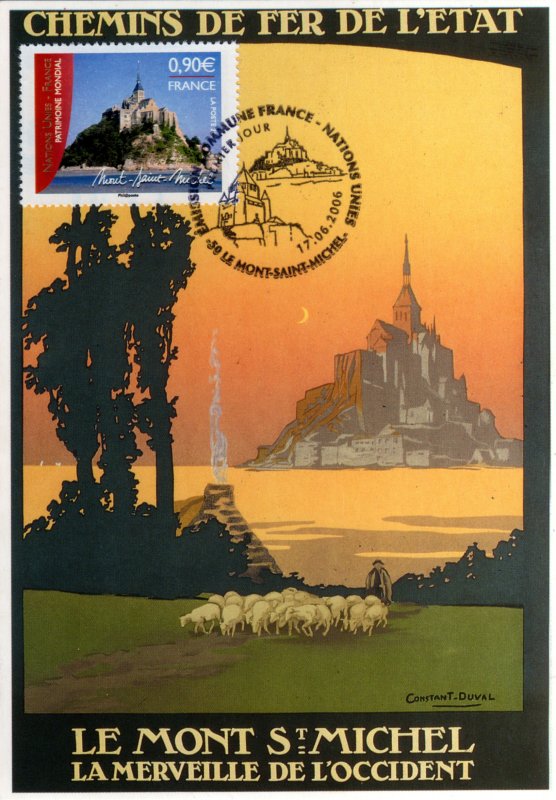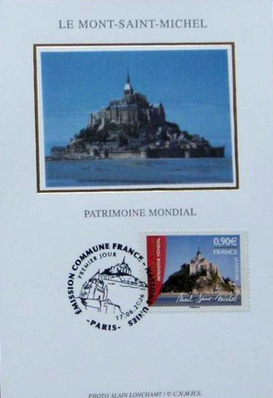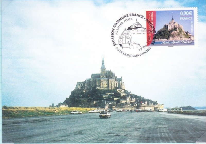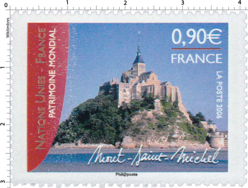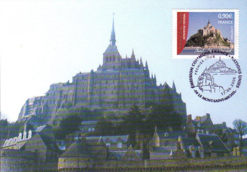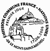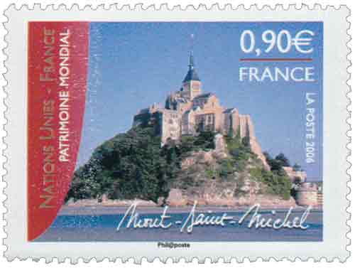 | Commentaire | Tous les ans, la Poste française procède à au moins une émission commune avec un pays étranger – la Slovaquie et l'Inde en 2003, la Belgique et le Canada en 2004, la République Tchèque et la Cité du Vatican en 2005. En 2006 a été inscrit une émission commune avec les Nations Unies sur le thème des sites inscrits au Patrimoine Mondial de l'UNESCO. Merveille de l'Occident, le Mont Saint Michel se dresse au cœur d'une immense baie envahie par les plus grandes marées d'Europe. Le village prospère sur le flanc sud-est du rocher, à l'abri de murailles remontant pour la plupart à la guerre de Cent ans. Celui-ci ayant depuis toujours une vocation commerciale. Inscrit au Patrimoine Mondiale par l'UNESCO en 1984, ce haut lieu touristique reçoit aujourd'hui plus de trois millions de visiteurs par an. Émission commune France/Nations-Unies |