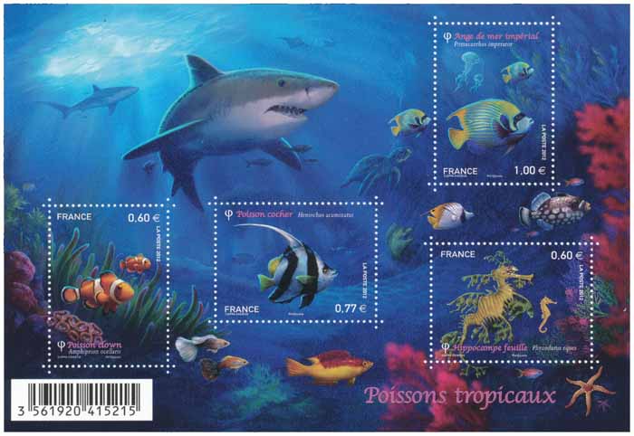 | Commentaire | Timbre à date “Premier Jour” conçu par Ciappa & Kawena. Étonnant de voir 2 Guppy (Poecilia reticulata - poissons d'eau douce) mâles au milieu des poissons marins. Ce bloc de timbres nous rappelle la fragilité des fonds marins. C’est d’ailleurs ce qu’on peut lire sur l’inscription que le requin porte sur son dos. Quant aux autres textes, ils contiennent une encre spéciale dont les teintes varient du rose au vert. Enfin, se jouant des requins qui l’entourent, une sirène phosphorescente apparaît dans l’obscurité.