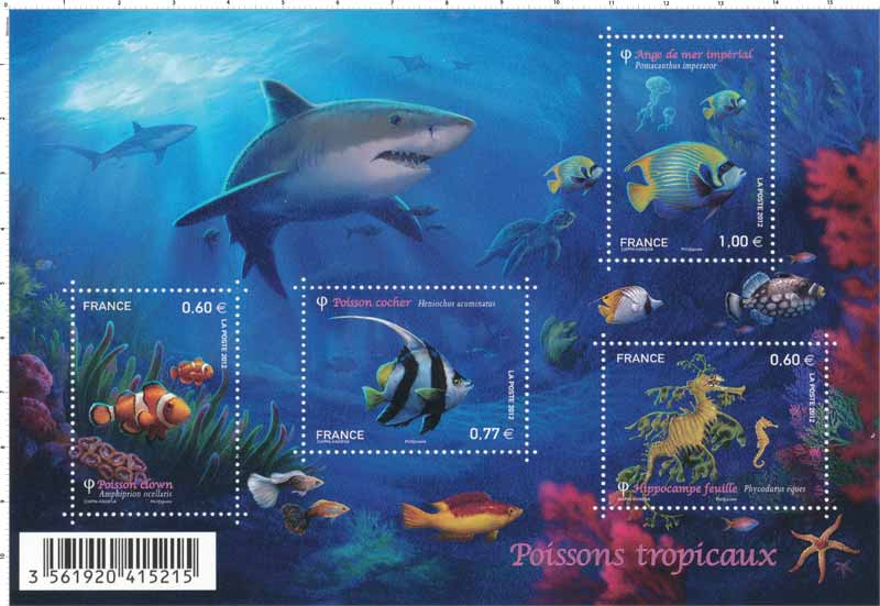 | Description | les poissons tropicaux : clown / cocher / Ange de mer impérial / hippocampe feuille. Micro-écriture sur le dos du requin et sirène phosphorescente en haut à gauche |