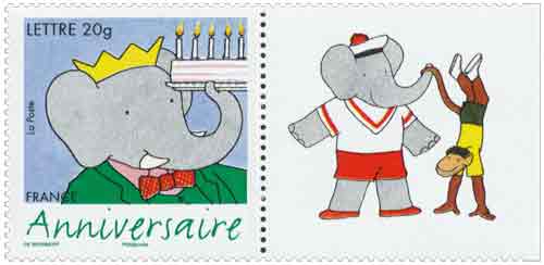 | Commentaire | En 2006, Babar fête ses 75 ans. Figure emblématique de la bande dessinée, créé par Jean de Brunhoff, puis repris par Laurent de Brunhoff, Babar incarne les valeurs fondamentales que sont la famille, la sagesse, le respect, l’écologie. Ce héros positif et aventureux est trans-générationnel et fait partie de la mémoire collective. Timbre sans millésime |