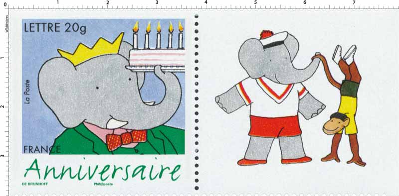 | Description | Timbre pour Anniversaires. Bande dessinée. 75 ans de l'éléphant Babar par l'auteur et dessinateur Jean de Brunhoff (1899-1937). Sans valeur indiquée (timbre à validité permanente - Lettre 20 g) |