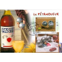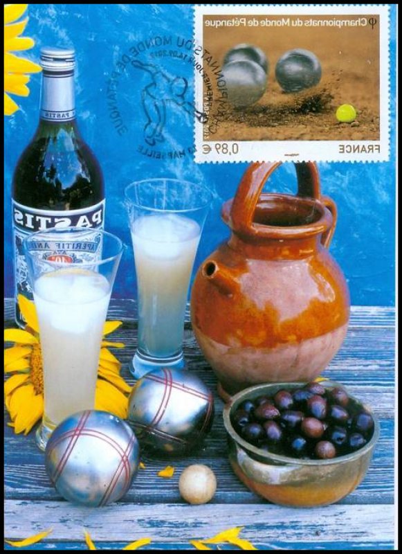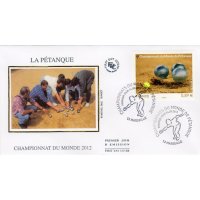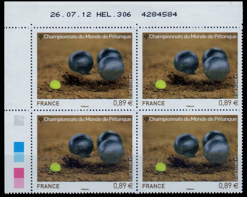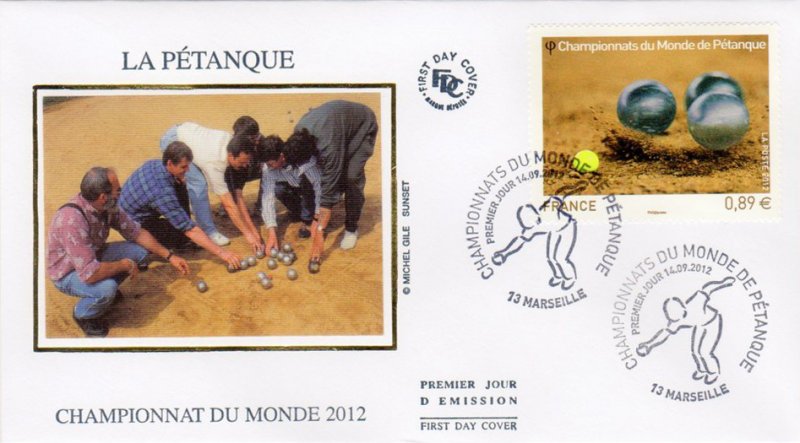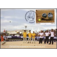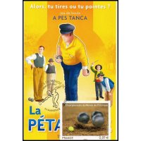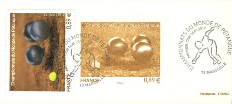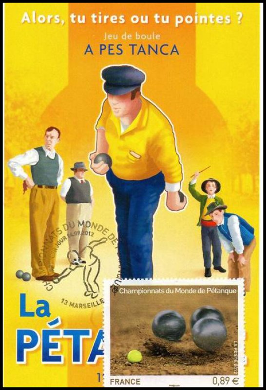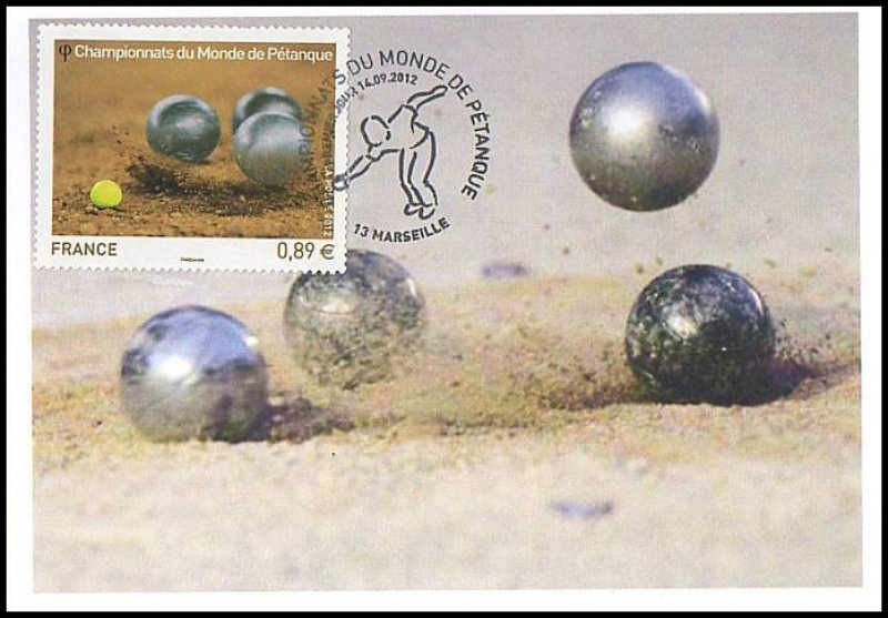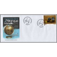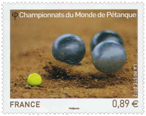 | Commentaire | Émission en planche de 5 bandes de 5 TP Du 4 au 7 octobre dernier, Marseille accueillait les championnats du monde de Pétanque. Avec des joueurs venant de 48 pays répartis sur les cinq continents, la cité phocéenne a été le théâtre d’une fête populaire et d’une compétition sportive de haut niveau, qui véhicule des valeurs fortes : hospitalité, précision, performance, endurance, esprit d’équipe, accessibilité. Deux titres majeurs étaient mis en jeu : celui de champion du monde Triplettes (par équipe) et celui de champion du monde de Tir de Précision (individuel). Le timbre est gaufré et les boules présentent des reflets argentés.