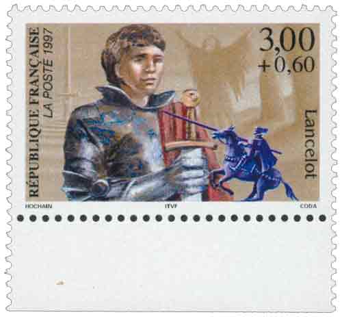 | Description | Lancelot, un des chevaliers de la Table Ronde de la légende arthurienne, thème développé par Chrétien de Troyes (1135-1190), trouvère et poète, né à Troyes, provenant d'une feuille de 50 TP |