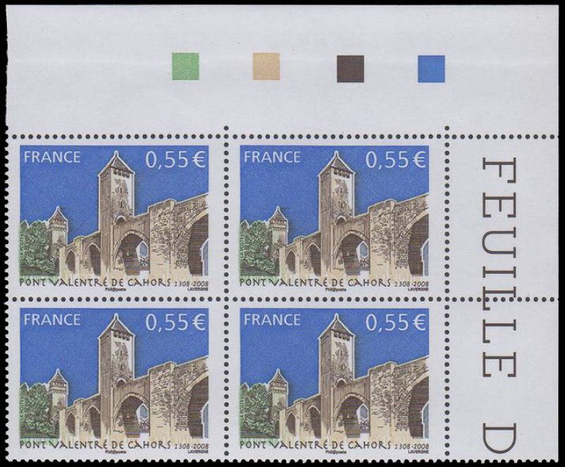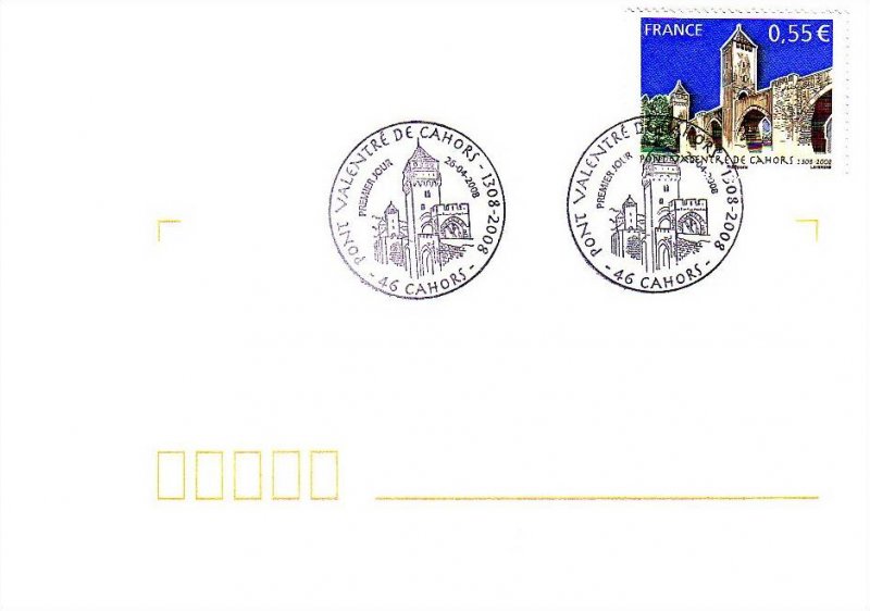 | Description | 700e anniversaire du pont Valentré de Cahors (1308-2008). Représentation du pont Valentré, situé en aval de Cahors, sur le Lot, et deux des trois tours carrées |