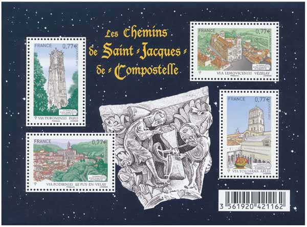 | Commentaire | Timbre à date “Premier Jour” conçu par Sophie Beaujard Une nouvelle série de timbres voit le jour en 2012 sur le thème des chemins de Saint-Jacques de-Compostelle. La route de Compostelle, vers le Finis Terrae du continent, est ancienne d’un millénaire et concerne l’ensemble du territoire européen. Autrefois principalement religieuse, la mouvance vers Compostelle favorise aussi la rencontre de personnes venues des quatre coins du continent et leur montre un chemin unissant passé et avenir*. Les quatre villes françaises de départ sont ici représentées sur les timbres sur un fond illustré du moulin mystique provenant d’un chapiteau de la basilique Sainte-Marie-Madeleine de Vézelay.