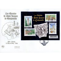 | Commentaire | Timbre à date “Premier Jour” conçu par Sophie Beaujard Une nouvelle série de timbres voit le jour en 2012 sur le thème des chemins de Saint-Jacques de-Compostelle. La route de Compostelle, vers le Finis Terrae du continent, est ancienne d’un millénaire et concerne l’ensemble du territoire européen. Autrefois principalement religieuse, la mouvance vers Compostelle favorise aussi la rencontre de personnes venues des quatre coins du continent et leur montre un chemin unissant passé et avenir*. Les quatre villes françaises de départ sont ici représentées sur les timbres sur un fond illustré du moulin mystique provenant d’un chapiteau de la basilique Sainte-Marie-Madeleine de Vézelay.