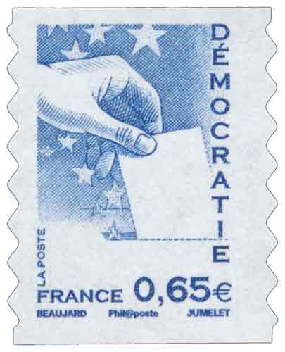 | Description | Carnet Marianne et les valeurs de l'Europe : Démocratie (main glissant un bulletin de vote dans une urne) |