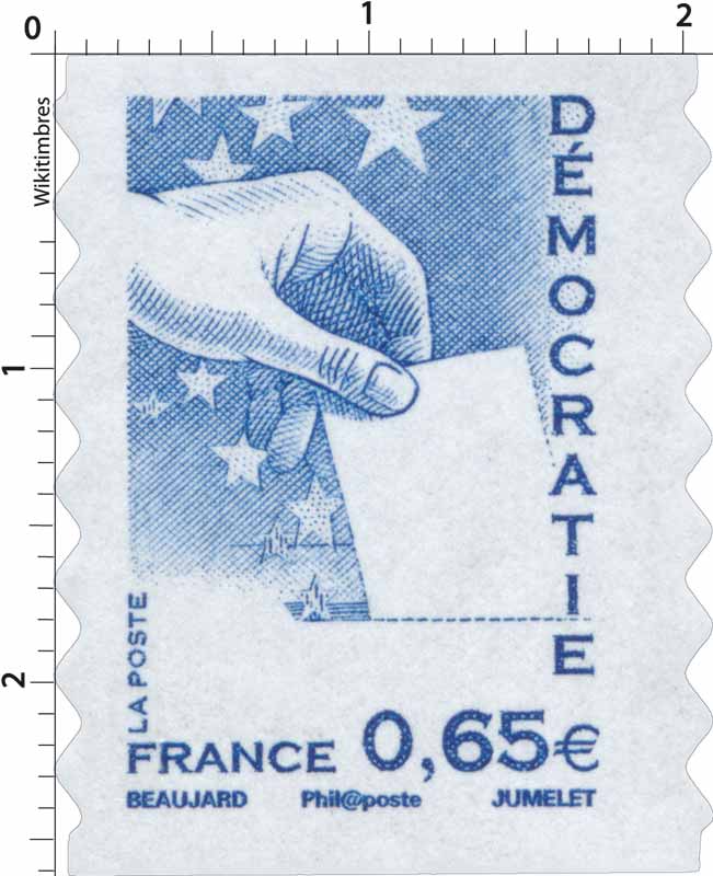 | Description | Carnet Marianne et les valeurs de l'Europe : Démocratie (main glissant un bulletin de vote dans une urne) |