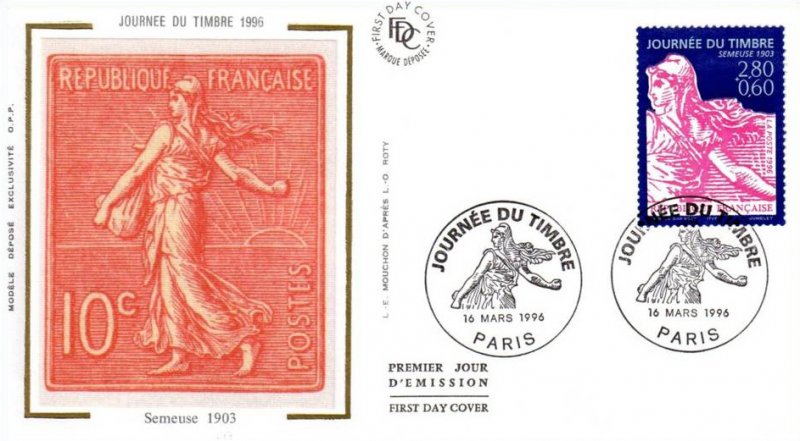| Description | Journée du Timbre 1996. Semeuse 1903 avec surtaxe, œuvre d'Oscar Roty (1846-1911), dessinateur de monnaies et de timbres (la semeuse), né à Paris, provenant d'une feuille de 40 TP |