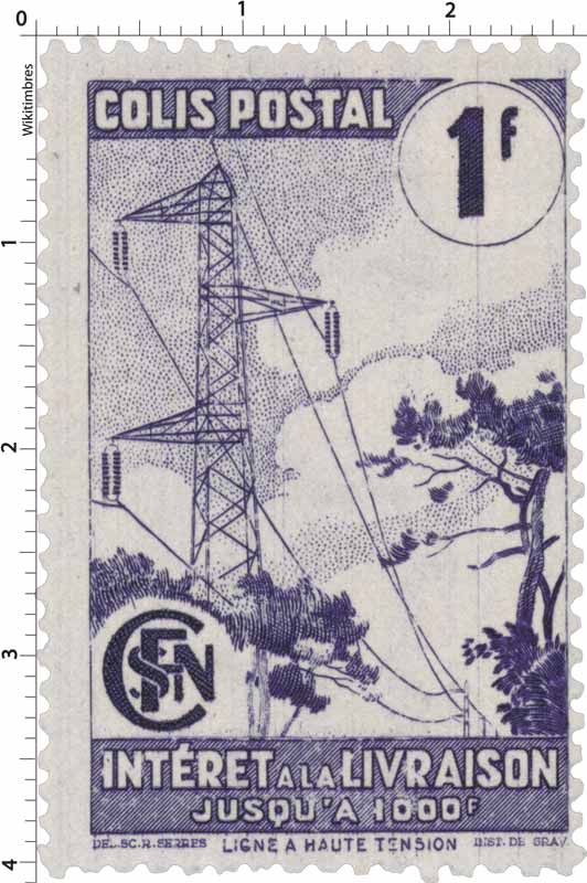 Timbre : 1944 COLIS POSTAL INTÉRÊT A LA LIVRAISON JUSQU'À 1000f ligne à haute tension Mesures Format d'imp 23 x 37 mm Dents incluses 26 x 40 mm Forme vertical Phosphore Non Impression Taille-douce Complément xxxxx Couleur violet Valeur 1f Dentelure - Emis en - Quantité - Auteurs Dessinateur Serres Graveur Institut de Gravure Mise en page xxxxx Mentions - Numéros & Dates N° Philatelix - N° Michel - Date d'émission 01/01/1944 Date de retrait - Classements Groupe Colis postaux 1944 1945 Catégorie Colis postaux Familles Usage - Régions - Départements - Description Colis postaux Commentaire - Mes timbres & notes personnelles www.wikitimbres.fr