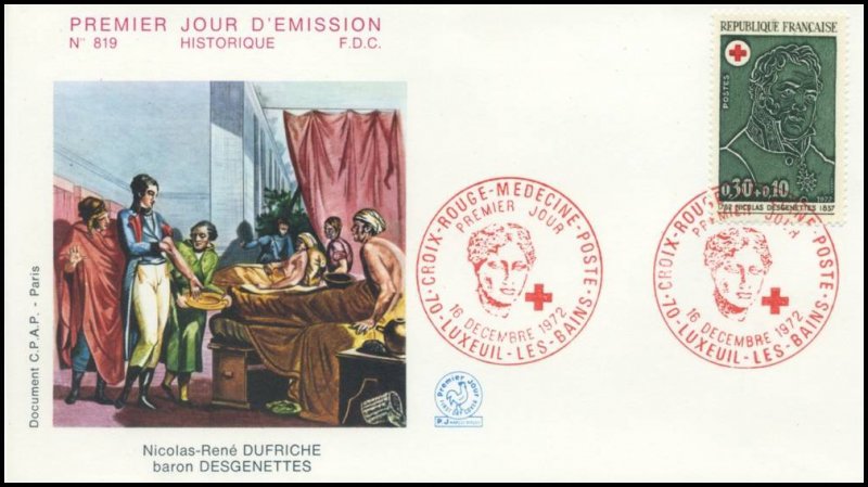 Les timbres de la série « Croix-Rouge » 1972 sont à l'effigie de deux illustres médecins du début du XIX· siècle: Desgenettes (1762-1837) et Broussais (1772-1838).