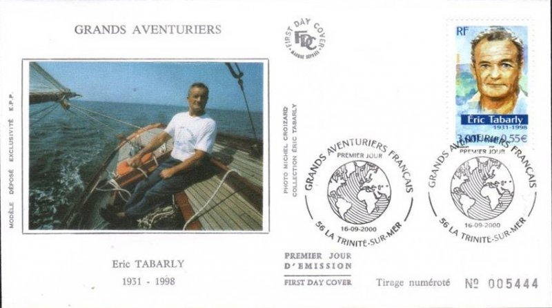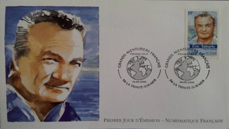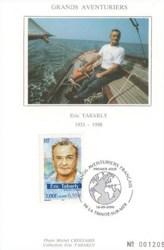 | Commentaire | Description synthétique du visuel du timbre : Éric Tabarly est né le 14 juillet 1934 à Nantes. Ingénieur de l’école navale, il est promu Lieutenant de vaisseau en 1966 puis Capitaine de frégate en 1982 et Capitaine de vaisseau (1988). Il fut vainqueur de nombreuses courses à bord de ses bateaux Pen Duick (« mésange à tête noire » en breton) : course transatlantique en solitaire en 1964 et 1977, course transpacifique en solitaire en 1969 … et s’illustra lors de courses et événements mythiques : record de vitesse, transat, course Los Angeles – Tahiti, course autour du monde. Ce marin exceptionnel par son éthique et son action, qui a favorisé le développement de la culture maritime, est mis en lumière à travers un portrait sur une évocation de mer. |