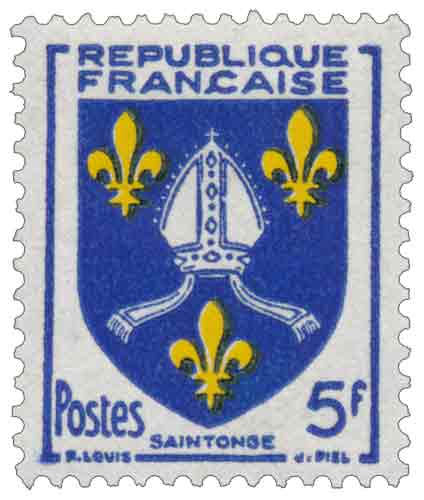| Commentaire | Émis par la France en 1954, ce timbre-poste gommé consacré aux armoiries de la Saintonge appartient à la septième série des Armoiries des provinces françaises, vaste ensemble philatélique destiné à illustrer l’héritage héraldique des anciens territoires à travers des valeurs adaptées aux usages postaux de masse de l’après-guerre ; mis en vente à partir du 15 novembre 1954 après un premier jour organisé à Paris le 11 novembre, il adopte un petit format vertical imprimé en typographie rotative, procédé retenu pour cette série à très fort tirage, et présente les armes traditionnelles de la Saintonge, caractérisées par la mitre épiscopale associée à des fleurs de lys, symbole directement lié à saint Eutrope, premier évêque de Saintes ; dessiné par Robert Louis et gravé par Jules Piel, le timbre est émis à la valeur faciale de 5 francs, correspondant à des usages spécifiques tels que l’affranchissement de certains envois à destination des militaires ou le complément de taxation pour des imprimés urgents, ce qui explique un emploi intensif et prolongé ; l’émission s’inscrit dans une démarche de valorisation des provinces de l’Ouest et du Sud-Ouest, la Saintonge correspondant à une ancienne province majoritairement située en Charente-Maritime et partiellement en Charente, dont l’histoire médiévale, marquée par les rivalités franco-anglaises et son rattachement définitif à la Couronne au XIVᵉ siècle, est condensée dans une iconographie héraldique immédiatement reconnaissable. |