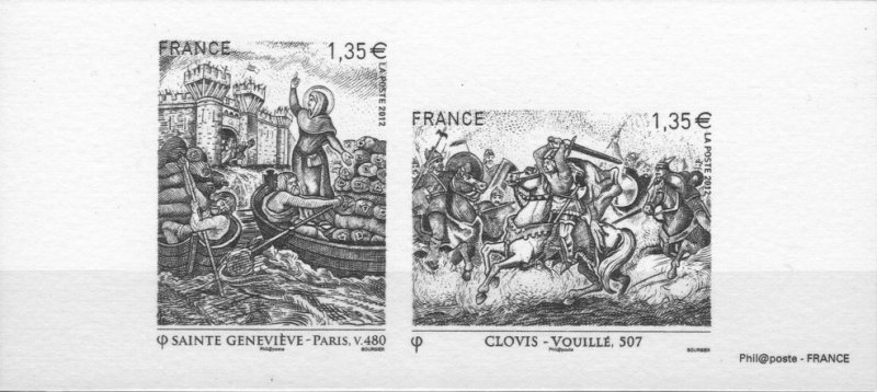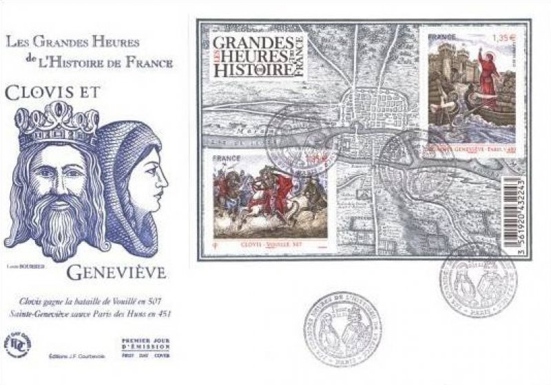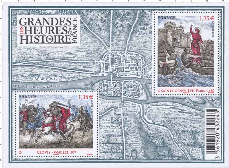 | Commentaire | En 2012, une nouvelle série est lancée sur le thème des grandes heures de l’Histoire de France. Sainte Geneviève et Clovis en sont les premiers "héros". Le visuel de Sainte Geneviève s’inspire d’un panneau en lave émaillée daté de 1875, oeuvre de Paul Balze, élève d’Ingres, qui constitue une partie du décor d’un devant d’autel de l’église Notre-Dame de la Croix de Ménilmontant. Les images de ce bloc nous rappellent celles des bons points historiques que les plus anciens d'entre nous ont pu recevoir, enfants, à l'école et qui restent des éléments forts de la mémoire collective des Français. En fond de bloc, une carte de “Lutèce conquise par les François sur les Romains”, réalisée par Jean-Baptiste Bourguignon d’Anville et gravée par Antoine Coquart (publiée en 1705). |