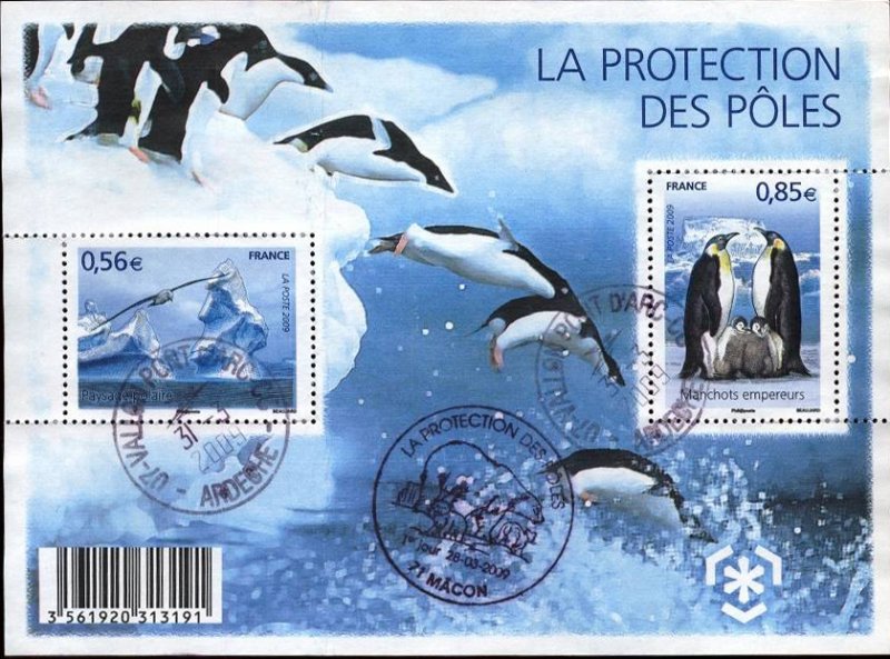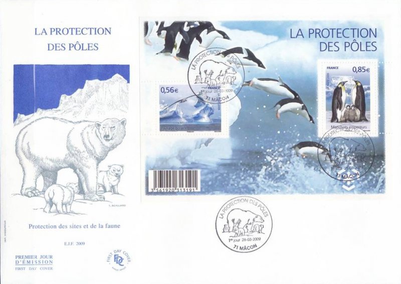 | Commentaire | La mise en vente anticipée a lieu du 27 au 29 mars 2009 au Salon philatélique de printemps à Mâcon. Un ours polaire et deux petits illustre le cachet premier jour par Beaujard. Les Postes chilienne et finlandaise ont invité d’autres opérateurs postaux à émettre des timbres-poste sur la thématique de la protection des pôles. Le choix graphique, les sujets et modes d’impression, sont laissés à l’initiative de chaque poste. L’idée étant avant tout de montrer l’attachement que portent les nations à l’univers polaire, de sensibiliser l’opinion sur le réchauffement climatique. |