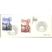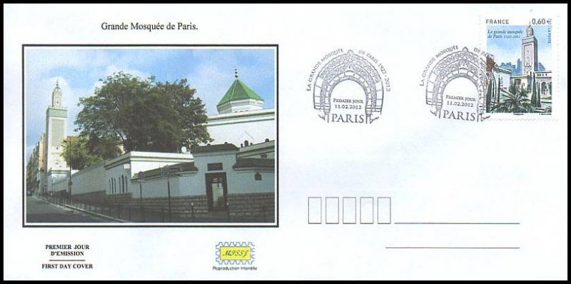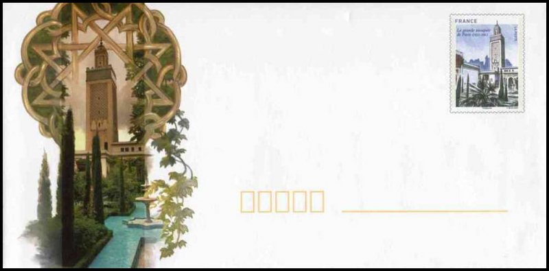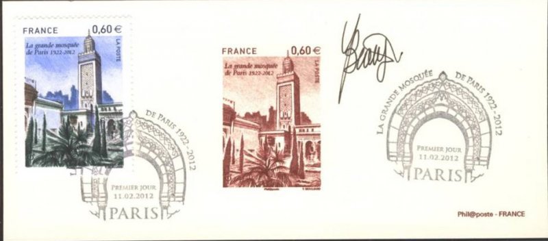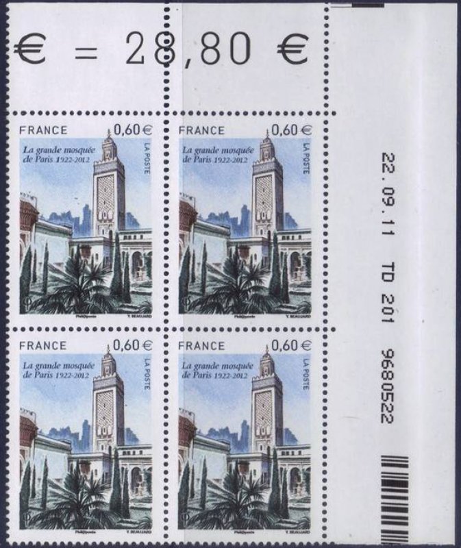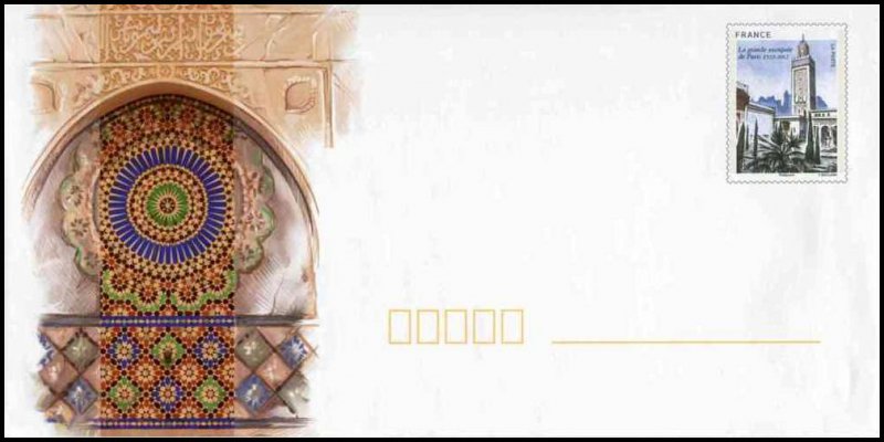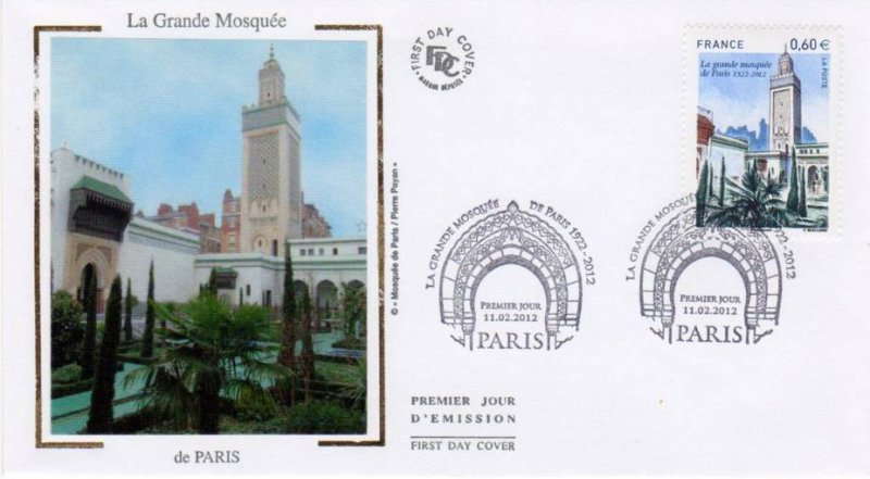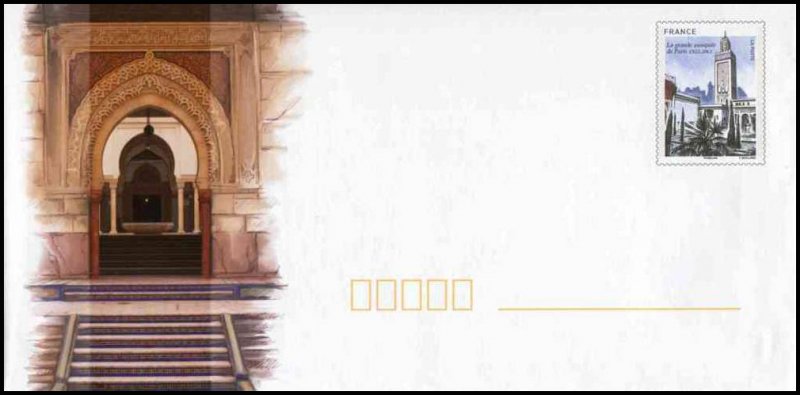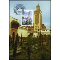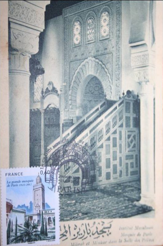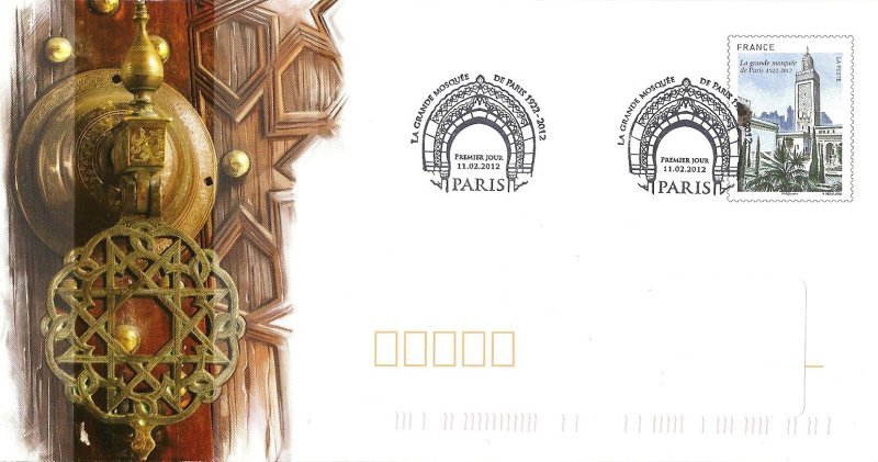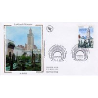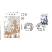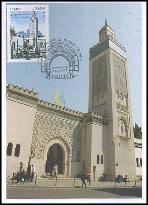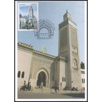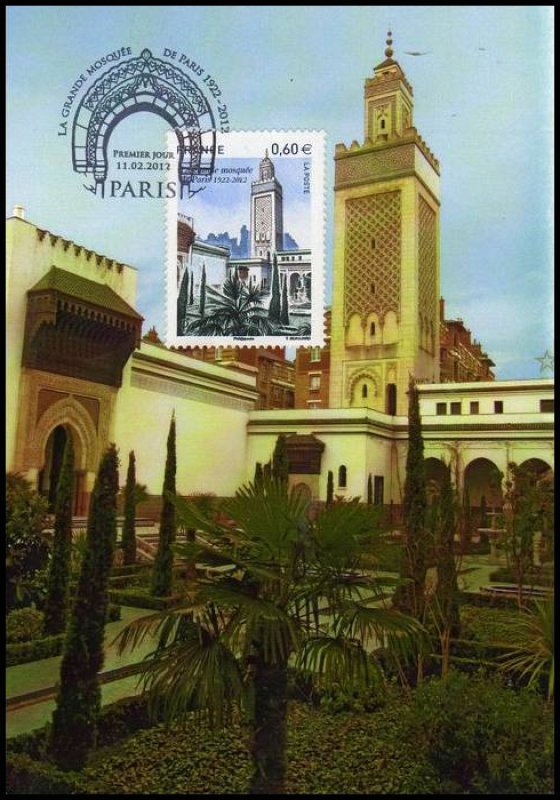 | Commentaire | Timbre à date “Premier Jour” conçu par Ciappa & Kawena Située dans le 5e arrondissement de Paris, La grande mosquée de Paris a été construite entre 1922 et 1926. De style hispano-mauresque, elle présente, dans son architecture et ses mosaïques, les aspects classiques et actuels de la civilisation de l’Art musulman. Le minaret, tour carrée parsemée de faïence turquoise ,s’élève à 33 m de haut. Il surplombe le patio, dont le cadre simple abrite néanmoins un riche décor - portes en chêne sculptées, mosaïques, marbre blanc - et la cour d’honneur (riad), inspirée des jardins hispanomauresques et des habitations seigneuriales de l’Afrique septentrionale, avec sa terrasse en marbre blanc, ses bassins et fontaines… À la fois lieu de culte de l’Islam, lieu de visite de nombreux touristes et d’enfants des écoles, ce monument d’art, d’histoire et de civilisation symbolise le lien et l’amitié entre la France et l’Islam. |