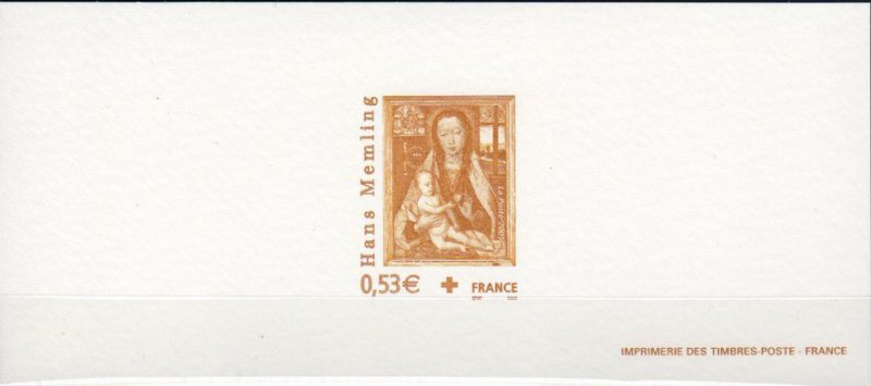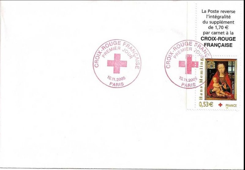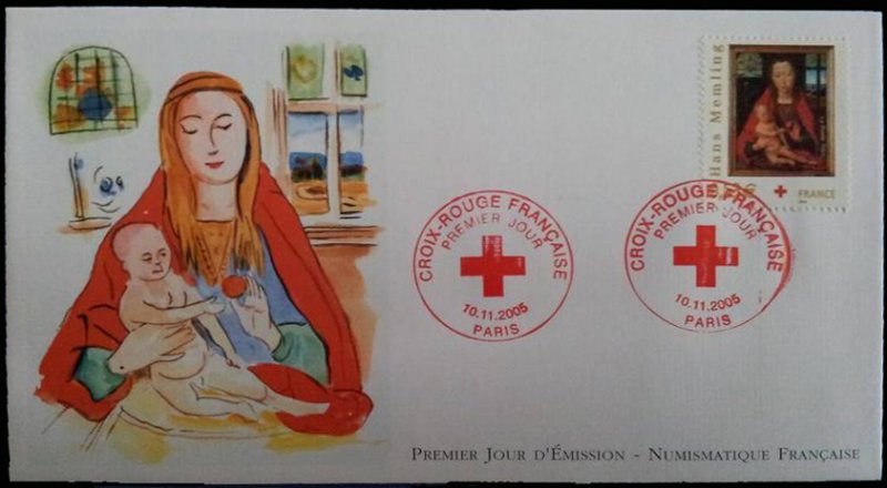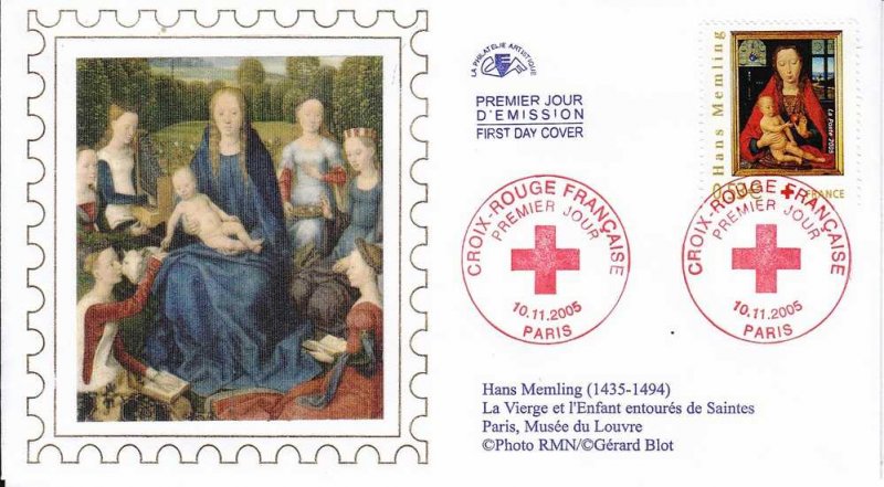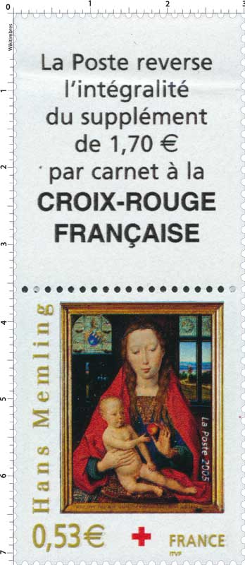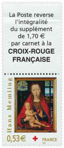 | Commentaire | Une effigie de la Vierge illustre à nouveau le timbre émis en 2005 pour la Croix-Rouge Française. Elle est extraite du panneau gauche du diptyque « La Vierge à l’enfant et Martin Van Nieuwenhoven » réalisé par Hans Memling en 1487 et conservé à Bruges (Musée Memling - Hôpital Saint-Jean). Memling, peintre Primitif flamand, né vers 1433 et mort à Bruges en 1494, s’inspira de Van Eyck et Van der Weyden dont il se distingue par un équilibre de noblesse et de douceur et par le sentiment de l’intimité qui se dégage de ses œuvres. Ce timbre est grevé d'une surtaxe au profit de la Croix Rouge française |