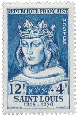| Commentaire | Erreur dans la date de naissance : Louis IX est né le 25 avril 1214 Ce timbre est grevé d'une surtaxe au profit de la Croix-Rouge française Émis en France en 1954, le timbre-poste gommé de la série de bienfaisance au profit de la Croix-Rouge française consacré à Saint Louis s’inscrit dans une émission collective dédiée à des personnages célèbres du XIIIᵉ au XXᵉ siècle, associant hommage historique et finalité caritative par l’application d’une surtaxe. Mis en circulation lors de la vente générale du 12 juillet 1954, ce timbre de 12 francs majoré de 4 francs appartient aux émissions françaises de bienfaisance et répond à des usages postaux courants, notamment pour l’affranchissement d’imprimés et de correspondances intérieures selon les tarifs en vigueur. Le sujet représente Louis IX, roi de France de 1226 à 1270, figure majeure du Moyen Âge capétien, dont le règne se caractérise par le renforcement de la justice royale, la consolidation des institutions du royaume et un rayonnement européen fondé sur l’arbitrage diplomatique et l’autorité morale, éléments qui expliquent sa canonisation rapide à la fin du XIIIᵉ siècle. L’iconographie choisie s’inscrit dans une tradition de représentation solennelle des souverains français, en cohérence avec la vocation mémorielle de la série, tandis que la gravure en taille-douce souligne la continuité entre l’art du timbre et l’héritage artistique national. Dessiné par Paul-Pierre Lemagny et gravé par Charles-Paul Dufresne, ce timbre associe évocation historique et fonction sociale, rappelant que les émissions philatéliques de bienfaisance occupent une place spécifique dans la production française de l’après-guerre ; à titre d’information consensuelle, la surtaxe perçue sur chaque figurine était intégralement destinée au financement des actions de la Croix-Rouge française. |