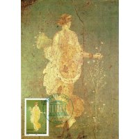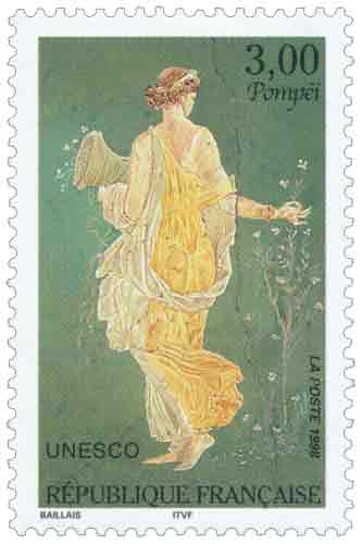 | Commentaire | Description synthétique du visuel du timbre : Pompéi, cité ensevelie le 24 août 79, constitue le plus beau site archéologique du monde. C’est au XVIIIe siècle que se développent les fouilles et entre 1875 et 1893 seulement que furent dégagées la rue de Stabies, ses maisons et leurs fresques. L’une d’elle figure sur le timbre. Est-ce Flora la déesse qui cueille des fleurs pour un bouquet divin ou une maîtresse de maison, une domina, qui cherche à décorer une pièce de sa maison et se promène drapée avec grâce dans un manteau coloré? Les divinités étaient proches des humains et il est parfois difficile de distinguer un sujet mythologique d’une scène quotidienne. |