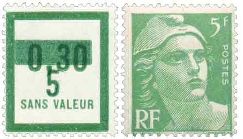 | Description | Rapprochement avec le timbre POSTE-1945-49 (fictif-1935-9 surchargé) |