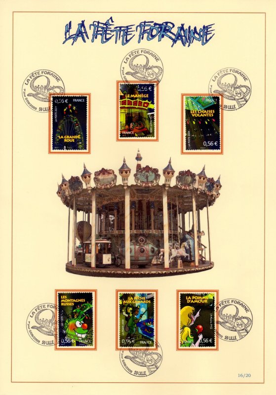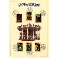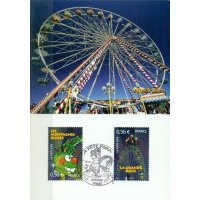 | Commentaire | La manifestation premier jour a lieu les 5 et 6 septembre à la foire aux manèges de Lille et le 5 septembre au Jardin d'acclimatation de Paris. Millet crée deux timbres à date spéciaux qui reprend le train « chenille » des montagnes russes du timbre pour Lille. À Paris, le sujet est une jeune fille chevauchant un cheval de manège |