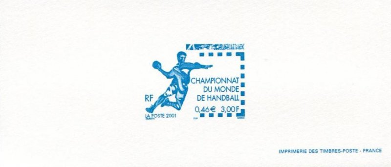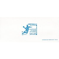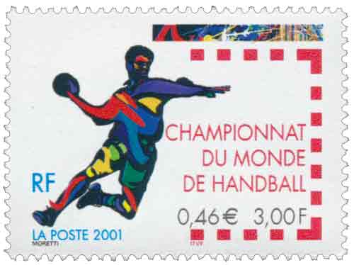 | Commentaire | Description synthétique du visuel du timbre : Le handball est un jeu qui oppose 2 équipes de 7 joueurs luttant pour la possession du ballon, l’objectif étant de lancer dans le but adverse et défendre son but contre les attaques de l’adversaire. Le jeu de handball présente peu de contraintes et son pouvoir attractif réside dans les courses, sauts, lancers et nombreux changements de rythme qui en font un sport à la fois simple et spectaculaire. Le visuel met en scène un joueur de handball en action. Les poteaux de but, rouge et blanc, caractéristiques de ce sport, sont intégrés avec originalité, à la verticale. |