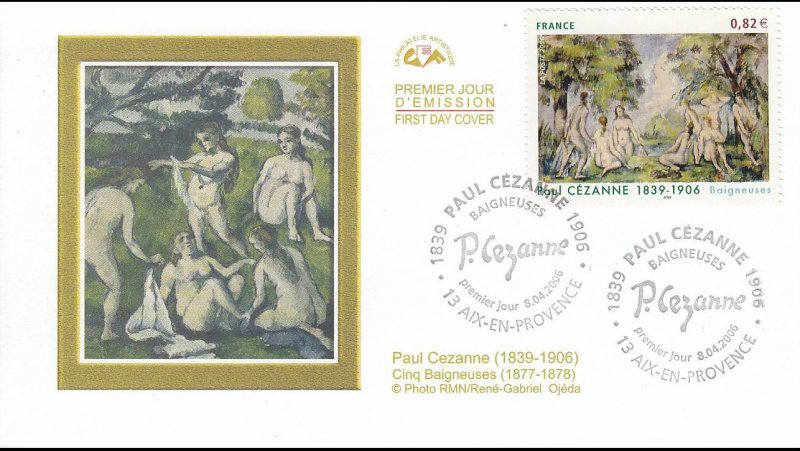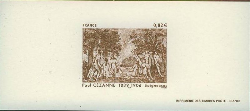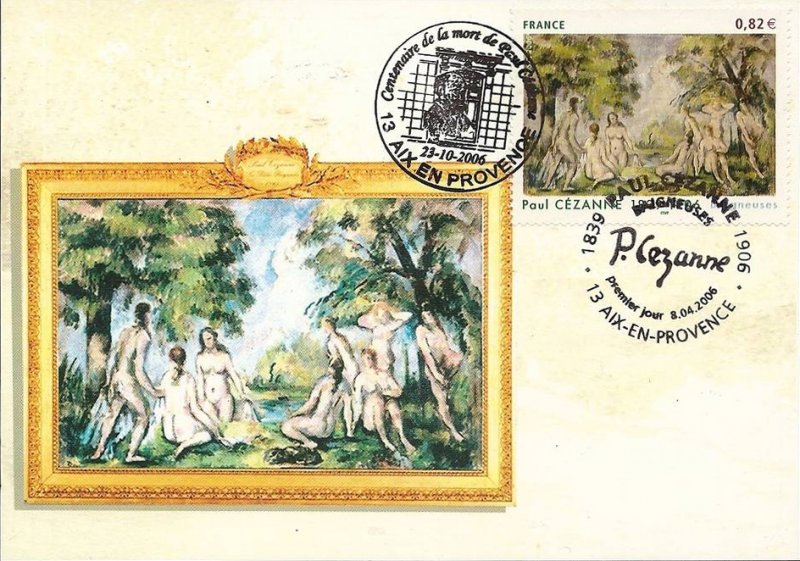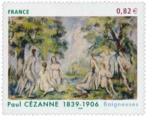 | Commentaire | En 1872, Paul Cézanne rejoignit Pissarro, à Pontoise, qui avait de tout temps un grand ascendant sur lui, et de qui l’influence va devenir prépondérante et déterminer le grand tournant pour l’accomplissement de son œuvre. Il retrouva Pissarro à Auvers-sur-Oise, où il vint se fixer pour deux années, à partir de 1873, auprès du docteur Gachet, l’ami des impressionnistes. Directement sous l’influence de Pissarro, il y peignit de nombreux paysages, parmi lesquels La maison du pendu à Auvers. Sa palette s’est éclaircie radicalement, il pratique la division de la touche, et surtout, désormais, il va renoncer, excepter pour les composition des Baigneuses, aux compositions ambitieuses pour une peinture d’après le modèle, sur nature, et le plein-air. L’œuvre reproduite sur le timbre-poste Baigneuses, conservée au musée Granet d’Aix-en-Provence est présumée peinte en 1895, puisque offerte par Cézanne à Marie Gasquet en 1896. |