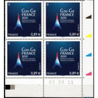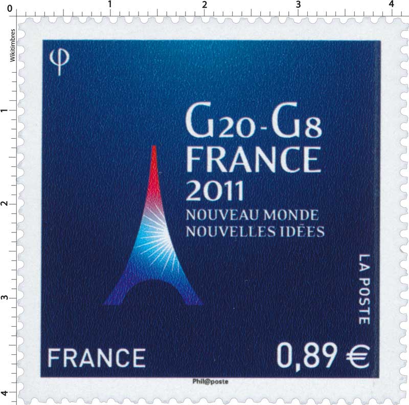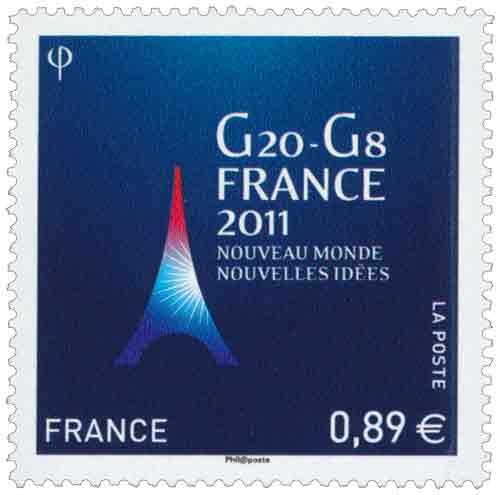 | Commentaire | Existe également en autoadhésif. Très graphique, très symbolique de la représentation de la France par l’épure de la Tour Eiffel et la déclinaison des couleurs nationales, ce timbre souligne les valeurs de tradition et d’innovation du G20 avec l’accroche : « nouveau monde, nouvelles idées ». Inscrit au programme philatélique officiel de l’année 2011, il est mis en page par Aurélie Baras, artiste graphiste Le G20 est né à la suite des crises financières qui ont frappé les pays émergents à la fin des années 1990. Le but était alors de réunir une fois par an les ministres des finances et les gouverneurs des banques centrales des pays riches et émergents afin de mettre en place une concertation internationale en matière économique. Le G20 représente 85 l’économie mondiale et les 2/3 de la population mondiale. Composé de l’Afrique du Sud, de l’Allemagne, de l’Arabie Saoudite, de l’Argentine, de l’Australie, du Brésil, du Canada, de la Chine, de la Corée du Sud, des Etats-Unis, de la France, de l’Inde, de l’Indonésie, de l’Italie, du Japon, du Mexique, du Royaume-Uni, de la Russie, de la Turquie et enfin de l’Union européenne, son principe repose sur un système de présidence tournante annuelle, dont la France a l’honneur d’assumer la responsabilité pour 2011 |