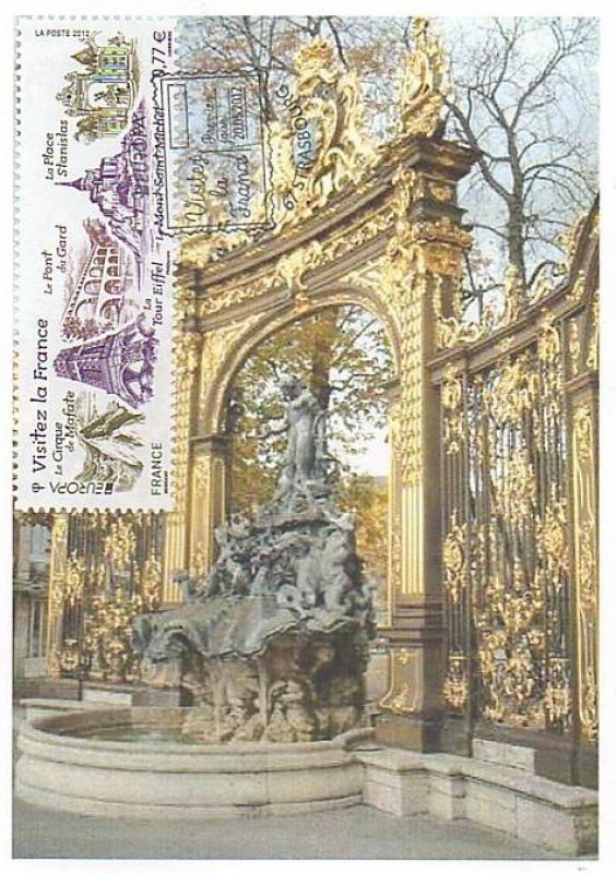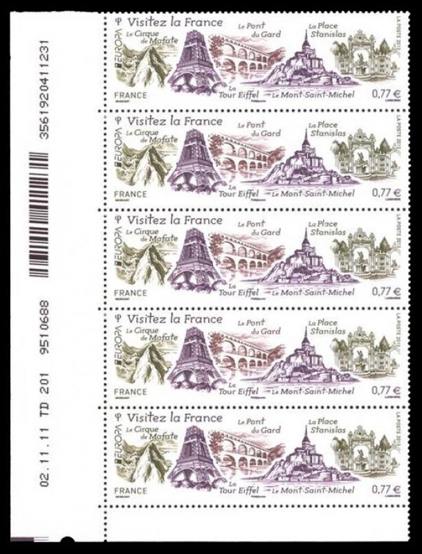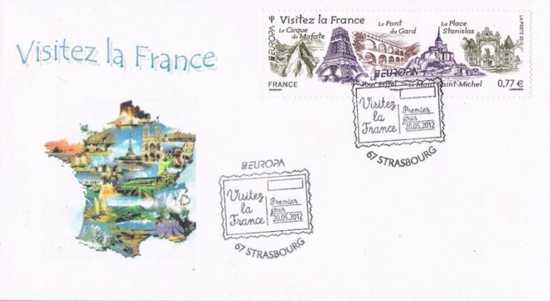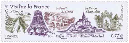 | Commentaire | EUROPA est une émission qui réunit une soixantaine de pays membres de PostEurop sur une thématique commune. “Visitez…” est le thème retenu pour 2012. Pour illustrer le timbre français, La Poste a choisi 5 monuments ou sites emblématiques : la place Stanislas à Nancy, le Mont Saint-Michel, la Tour Eiffel, le Pont du Gard et le Cirque de Mafate, à la Réunion.