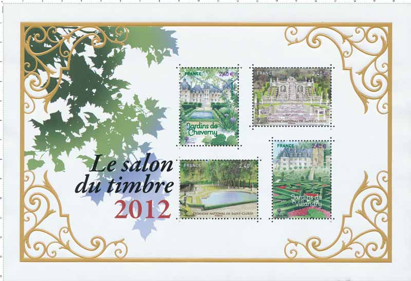 Depuis 2004, La Poste émet un bloc doré reprenant les timbres des blocs Jardins de France de l’année et de l’année précédente. L'édition 2012 propose donc les timbres des blocs Jardins de Cheverny et Villandry de 2011, et ceux du domaine de Saint-Cloud de cette année. Pour les visiteurs du Salon, la dorure à chaud est apposée sur place.