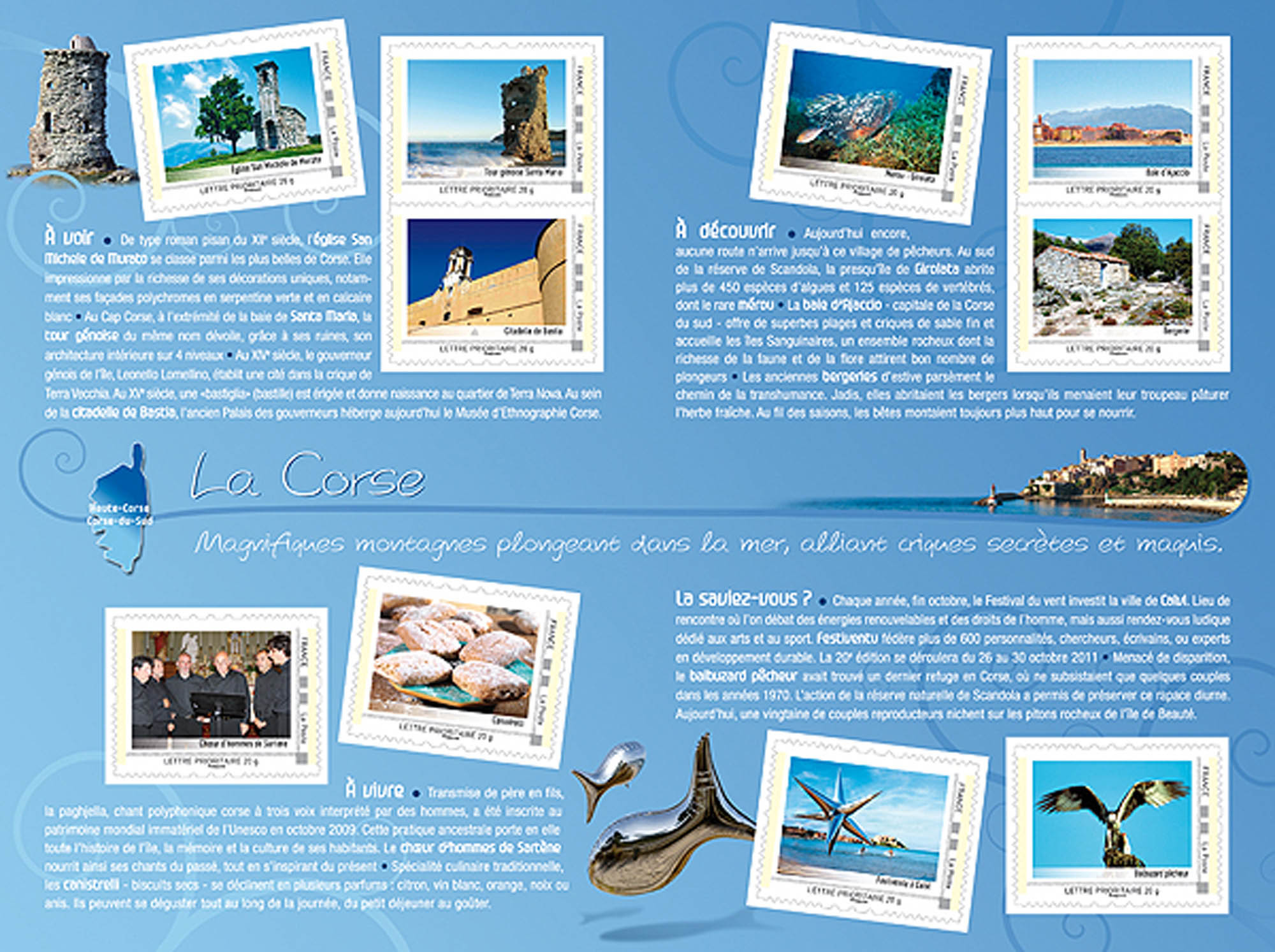 | Commentaire | Eglise San Michele de Murato, Tour génoise Santa Maria, Citadelle de Bastia, Chœur d’hommes de Sartène, Canistrelli, Mérou- Girolata, Baie d’Ajaccio, Bergerie, Festiventu à Calvi, Balbuzard pêcheur |