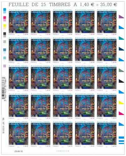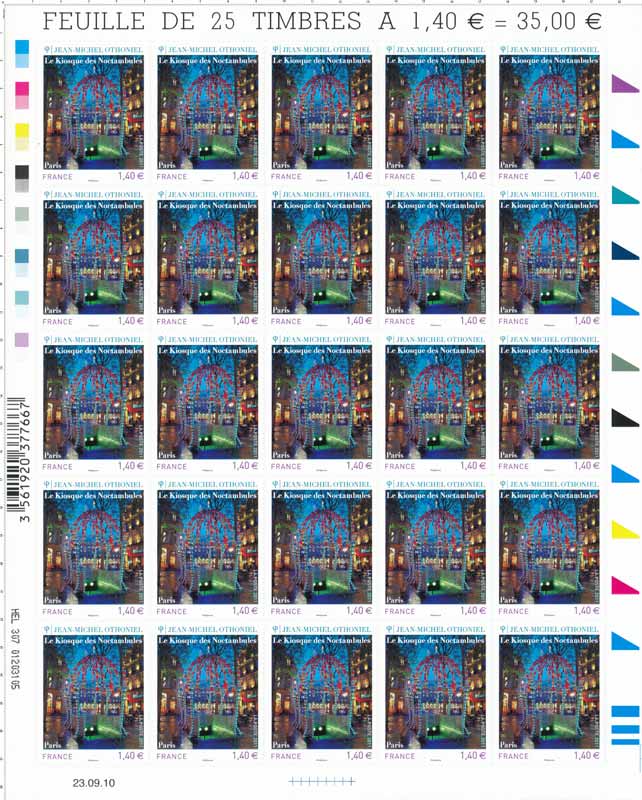 | Commentaire | Existe également sur papier gommé. Cette année, Phil@poste rend hommage au travail de Jean-Michel Othoniel à travers son œuvre “Le Kiosque des Noctambules, Paris”. Un siècle après Hector Guimard, Jean-Michel Othoniel transforme l’entrée de la station de métro parisienne, Palais Royal - Mus |