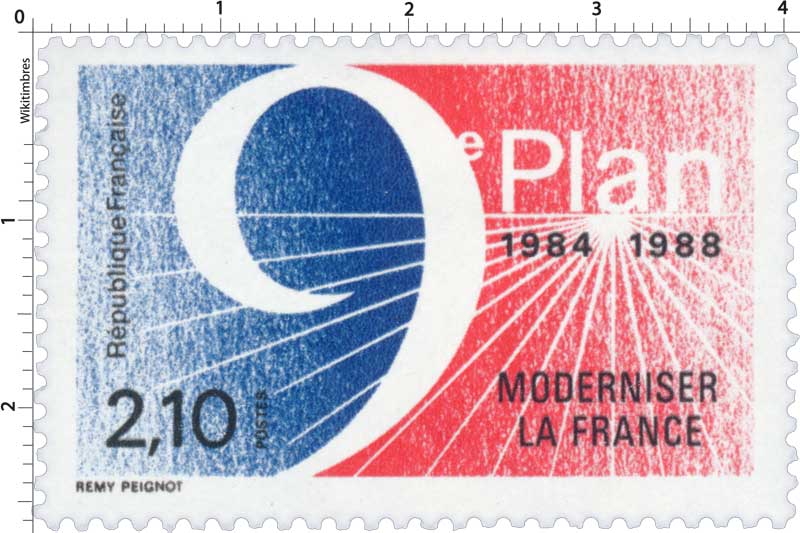 Timbre : 9e PLAN 1984-1988 MODERNISER LA FRANCE Mesures Format d'imp 36 x 22 mm Dents incluses 40 x 26 mm Forme horizontal Phosphore Non Impression héliogravure Complément xxxxx Couleur bleu, rouge et noir Valeur 2 F 10 c Dentelure 13 Emis en feuille de 50 TP Quantité 10 000 000 Auteurs Dessinateur Rémy Peignot Graveur xxxxx Mise en page xxxxx Mentions Création de Rémy Peignot Numéros & Dates N° Philatelix 2500 N° Michel 2475 Date d'émission 10/12/1984 Date de retrait 10/05/1985 Classements Groupe Commémoratifs et divers : 1984 Catégorie Timbres poste Familles politique société Usage lettres simples jusqu'au 31 juillet 1985 Régions - Départements - Description 9e plan, moderniser la France (1984-1988) Commentaire - Mes timbres & notes personnelles www.wikitimbres.fr