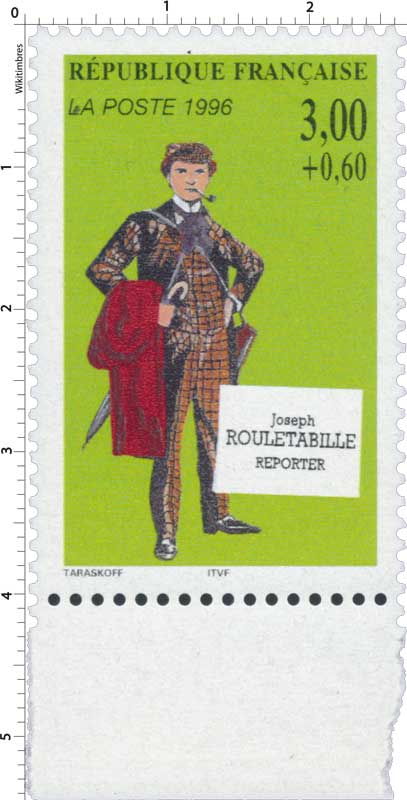 | Description | Rouletabille créé par Gaston Leroux (1868-1927), romancier, né à Paris, timbre provenant d’une feuille de 50 |
