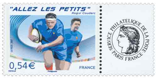 | Commentaire | En vue de la prochaine coupe du monde de Rugby qui se déroulera en France en septembre 2007, La Poste émet un premier timbre « annonce » en avril 2007. Pour soutenir et encourager les « Bleus » tous reprennent le légendaire « Allez les petits » que clamait le célèbre commentateur Roger Couderc. |
