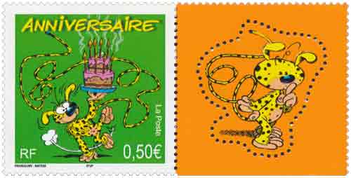 | Description | Timbre pour anniversaires. Marsupilami tenant un gâteau. Personnage de bande dessinée. |