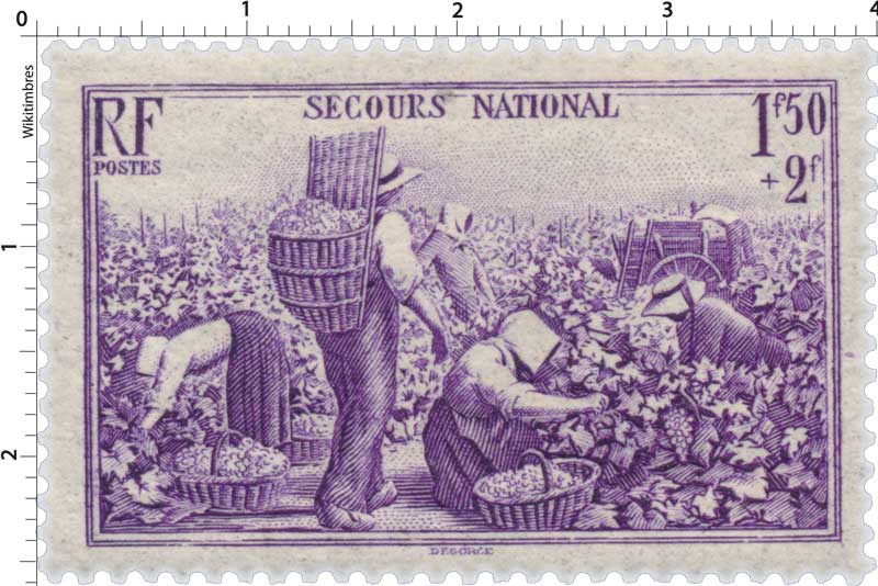 Timbre : 1940 SECOURS NATIONAL Mesures Format d'imp 36 x 22 mm Dents incluses 40 x 26 mm Forme horizontal Phosphore Non Impression Taille-douce Complément xxxxx Couleur violet Valeur 1 F 50 c + 2 F Dentelure 13 Emis en feuille de 25 TP Quantité 1 230 000 Auteurs Dessinateur Georges Léo Degorce Graveur Georges Léo Degorce Mise en page xxxxx Mentions Création de Georges Léo Degorce Numéros & Dates N° Philatelix 567 N° Michel 498 Date d'émission 02/12/1940 Date de retrait 16/08/1941 Classements Groupe Du secours national 1940 Catégorie Timbres poste Familles paysans métiers Usage cartes postales pour l'étranger Régions - Départements - Description Au profit du Secours national. Vendanges Commentaire Secours National - Vendanges. Mes timbres & notes personnelles www.wikitimbres.fr