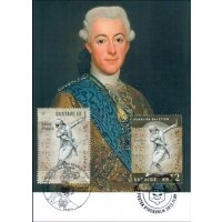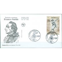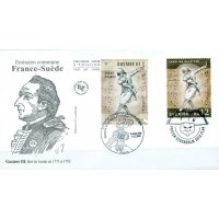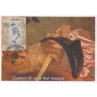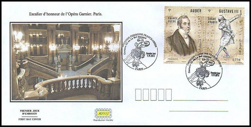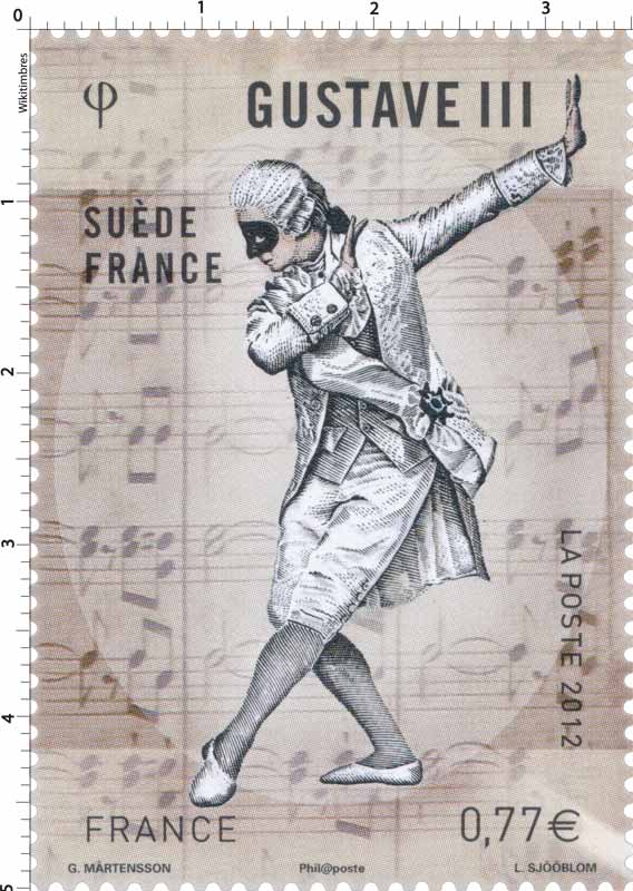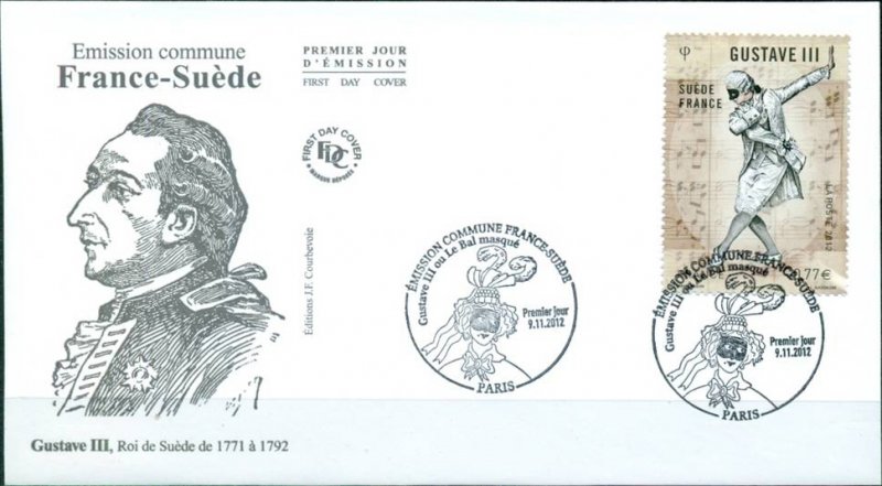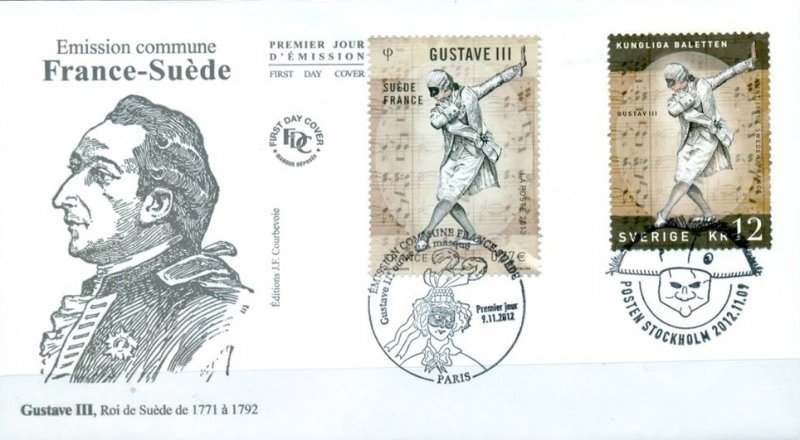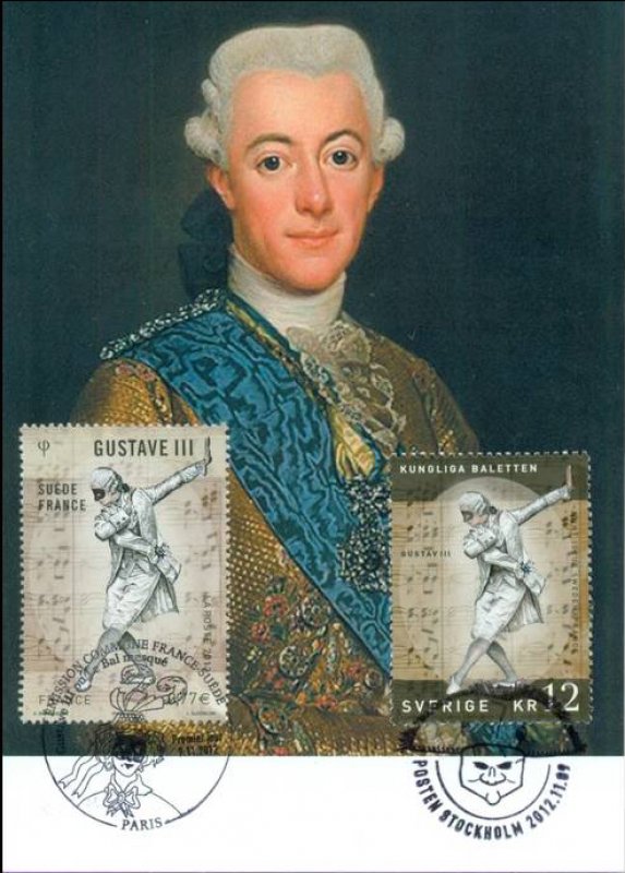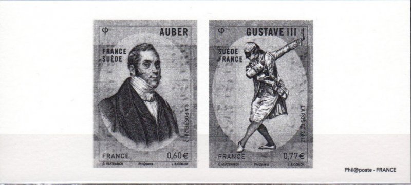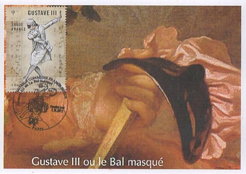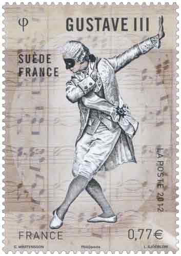 | Commentaire | L’émission commune entre la France et la Suède met à l’honneur l’Opéra Garnier de Paris et l’Opéra de Stockholm. Gustave III, roi de Suède de 1771 à 1792, grand francophile, à qui Louis XVI a cédé l’île de Saint-Barthélemy (rétrocédée à la France en 1878 et rattachée à la Guadeloupe dont elle devient une commune en 1946) fut assassiné en 1792. Un opéra créé par Daniel Auber, Le Bal masqué, retrace et met en scène les dernières heures de Gustave III. Le 1er timbre reprend un portrait de Daniel Auber, le 2e évoque le ballet. Le fond de bloc, quant à lui, représente l’escalier d’honneur de l’Opéra Garnier.